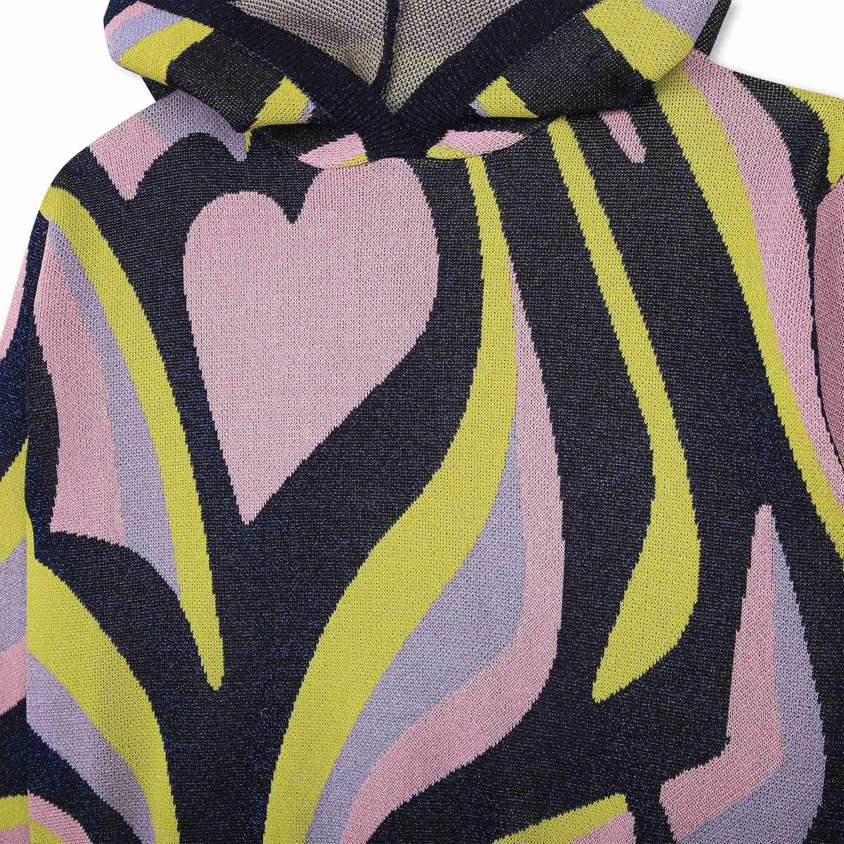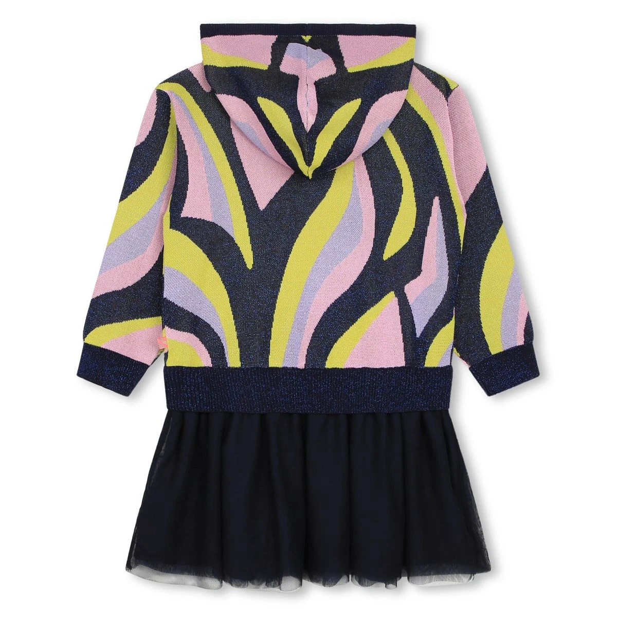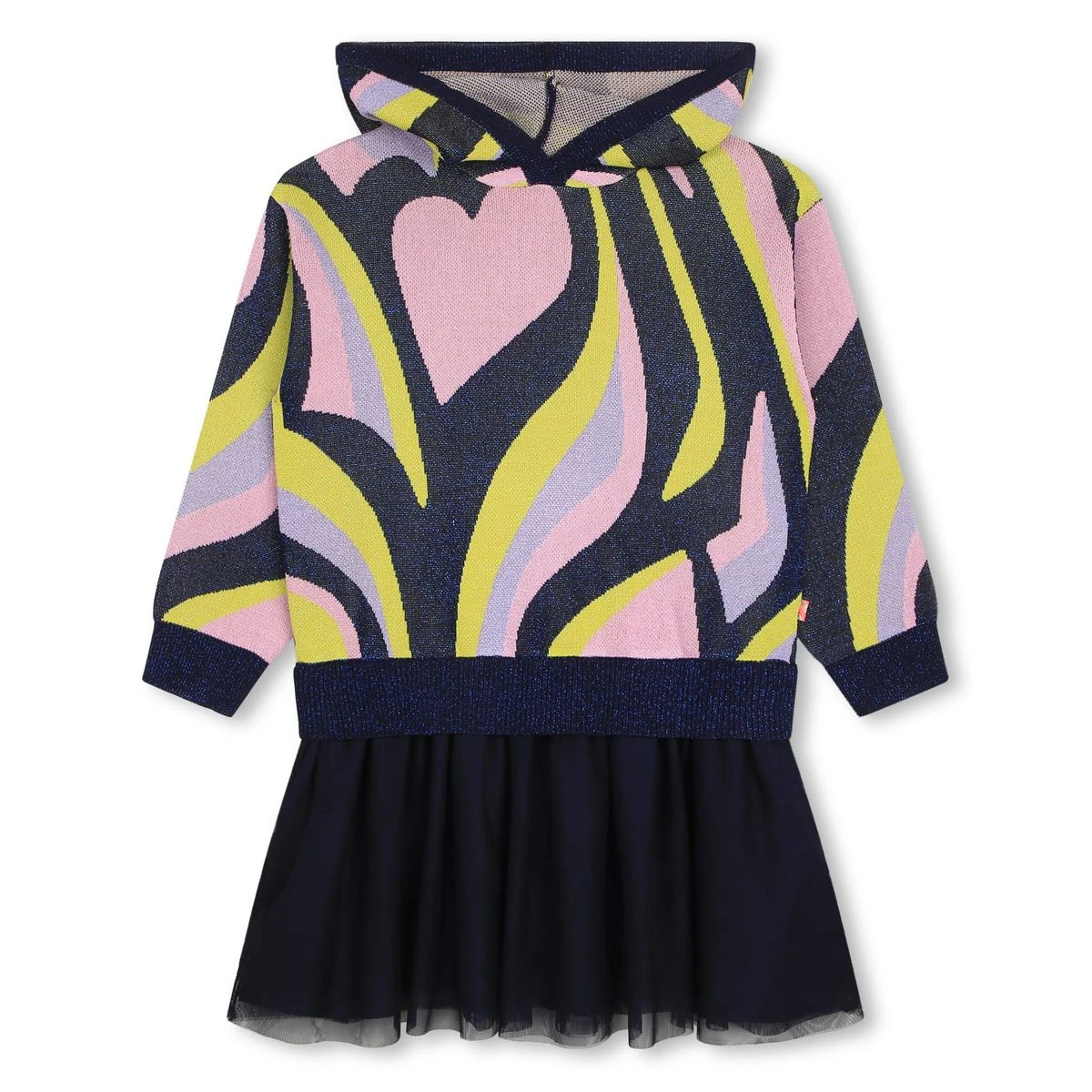 Composée d’un haut en maille brillante et d’une jupe en tulle, cette robe Billieblush mixe habilement les matières. La capuche et la partie supérieure se parent d’un motif coeurs original. Une étiquette rayée est cousue sur le côté.