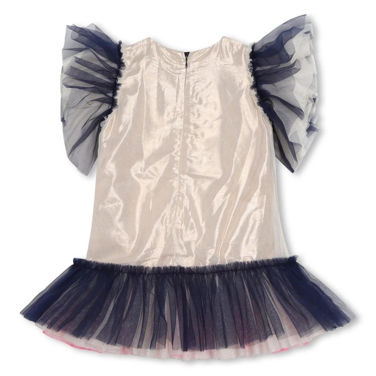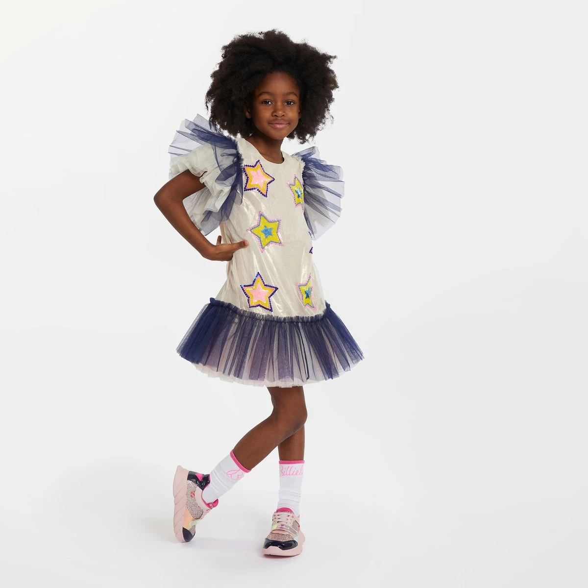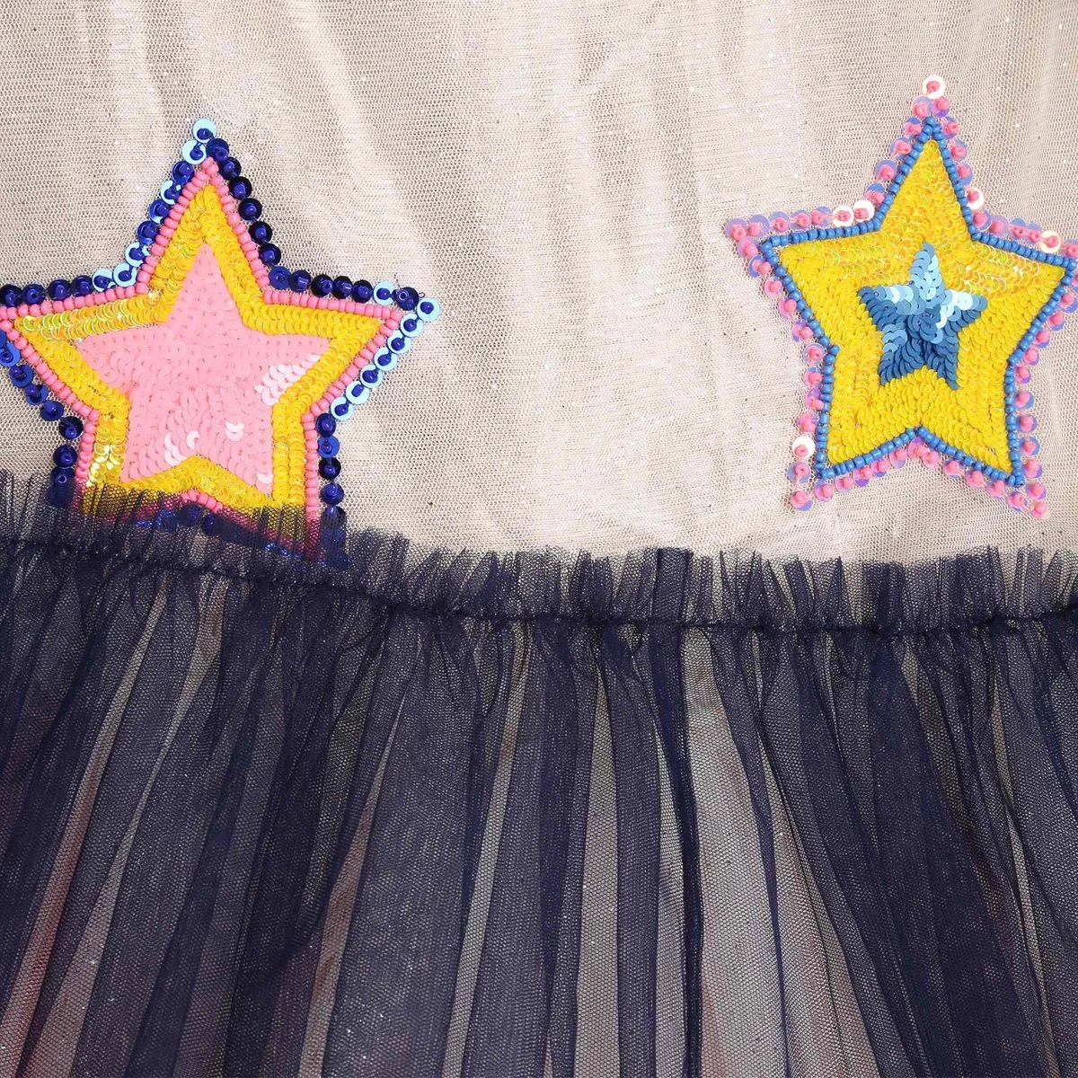 Cette robe de cérémonie Billieblush est confectionnée en tulle pailleté et doublé. Une superposition de volants multicolores constitue les manches courtes et la base. Des étoiles brodées de sequins égaient le devant de ce modèle zippé au dos.