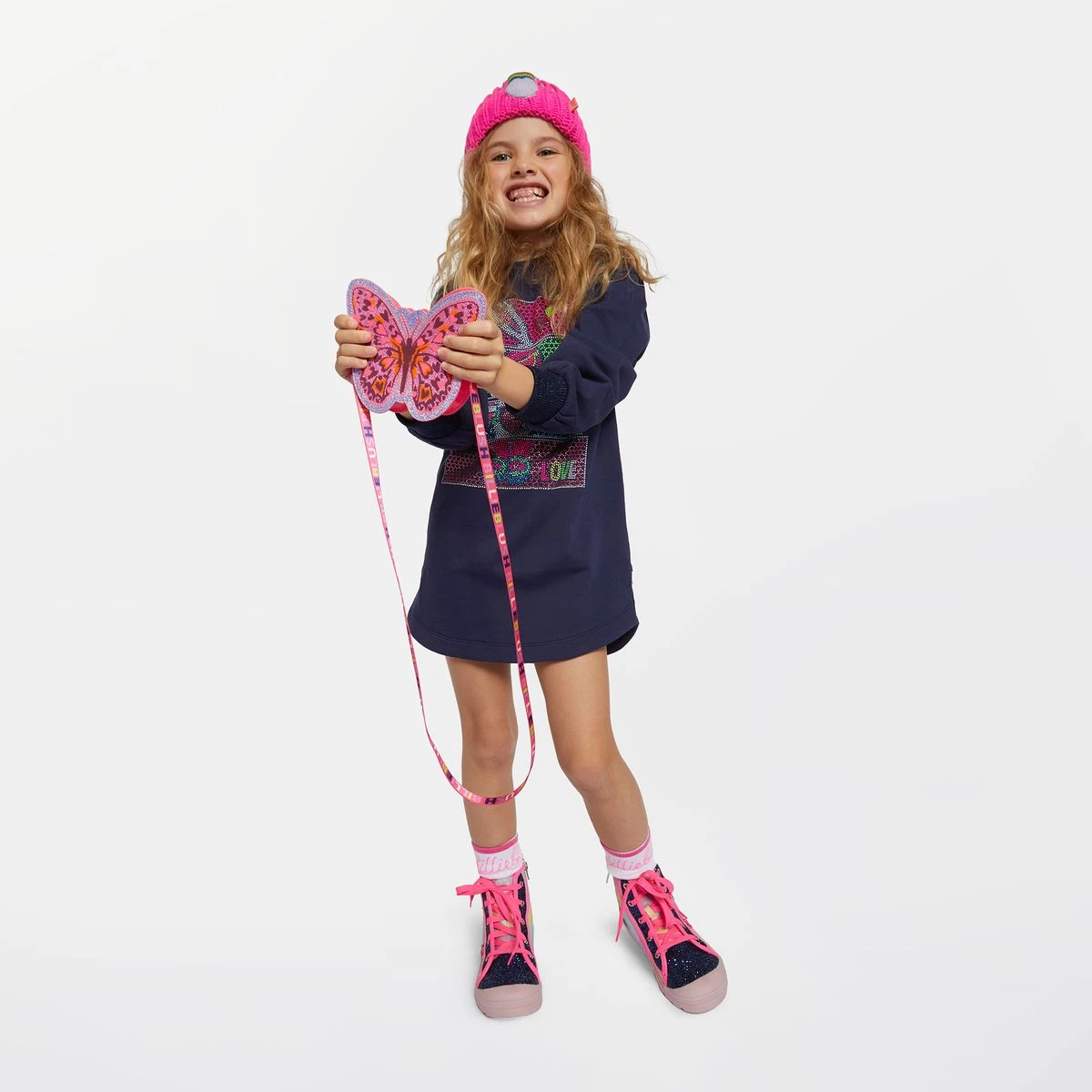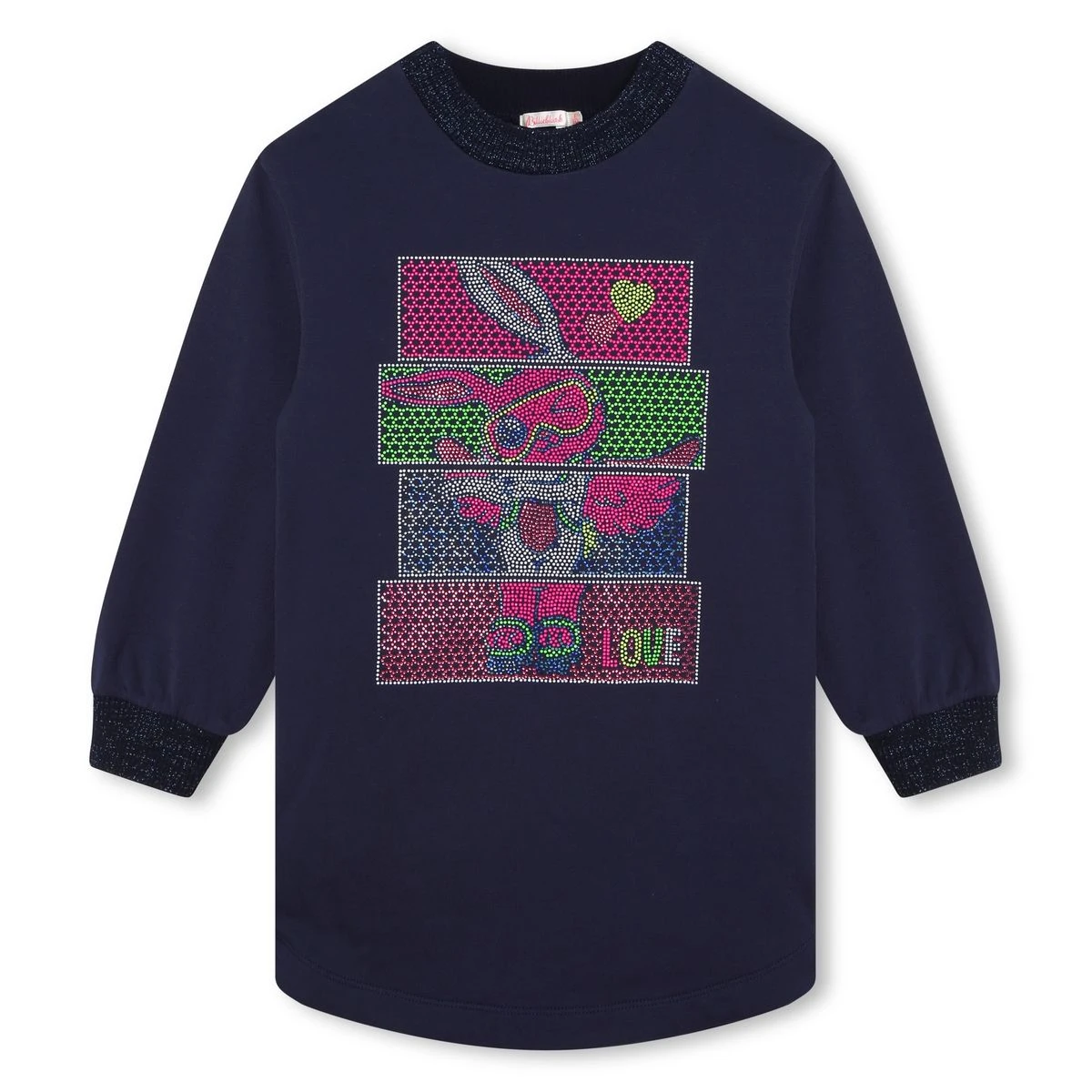 Cette robe sweat-shirt Billieblush est confectionnée en molleton 100 % coton. Le devant est décoré d’une illustration fantaisie composée de strass multicolores. Détail de charme, les poignets et le col en bord-côte arborent une finition pailletée.