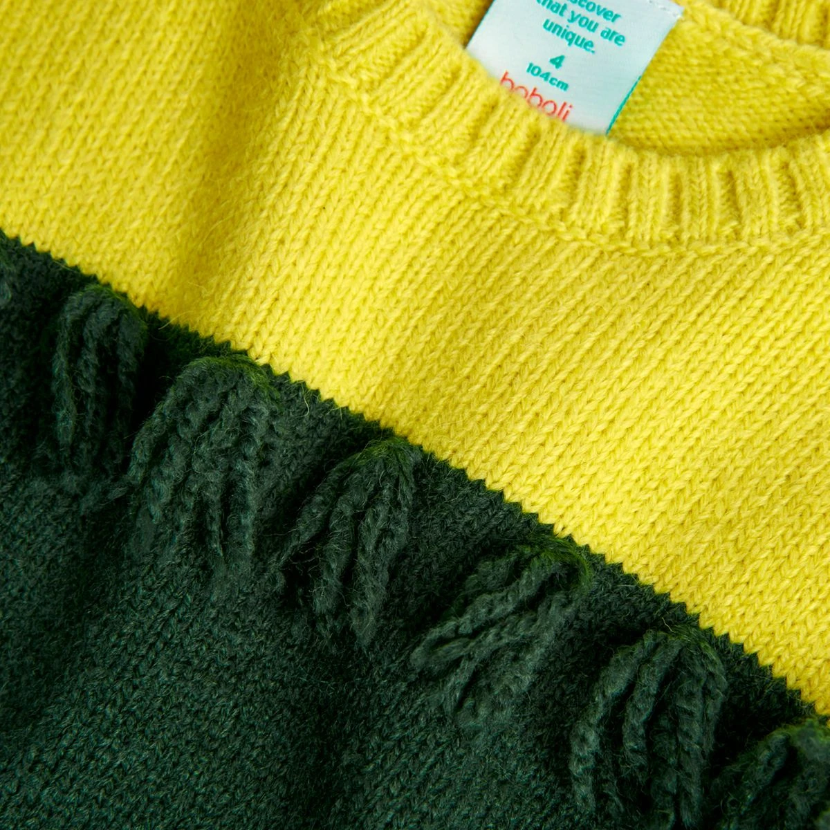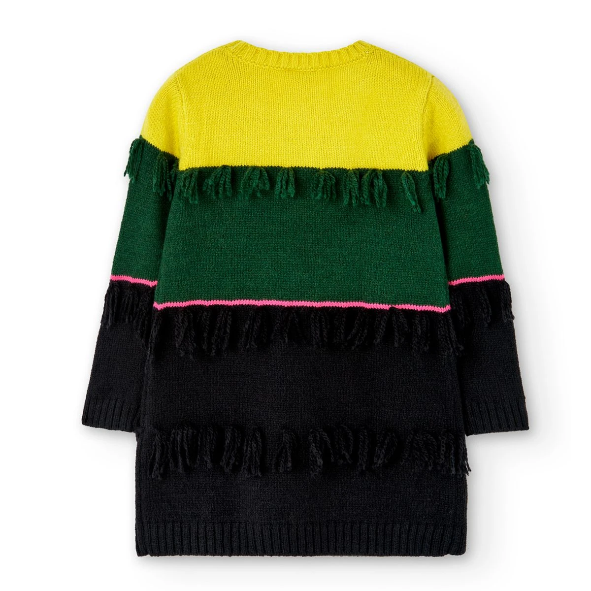 Vestido de tricotosa de niña combinado en varios colores y con flecos como decoración. Disponible de la talla 4 años a la 16 años.