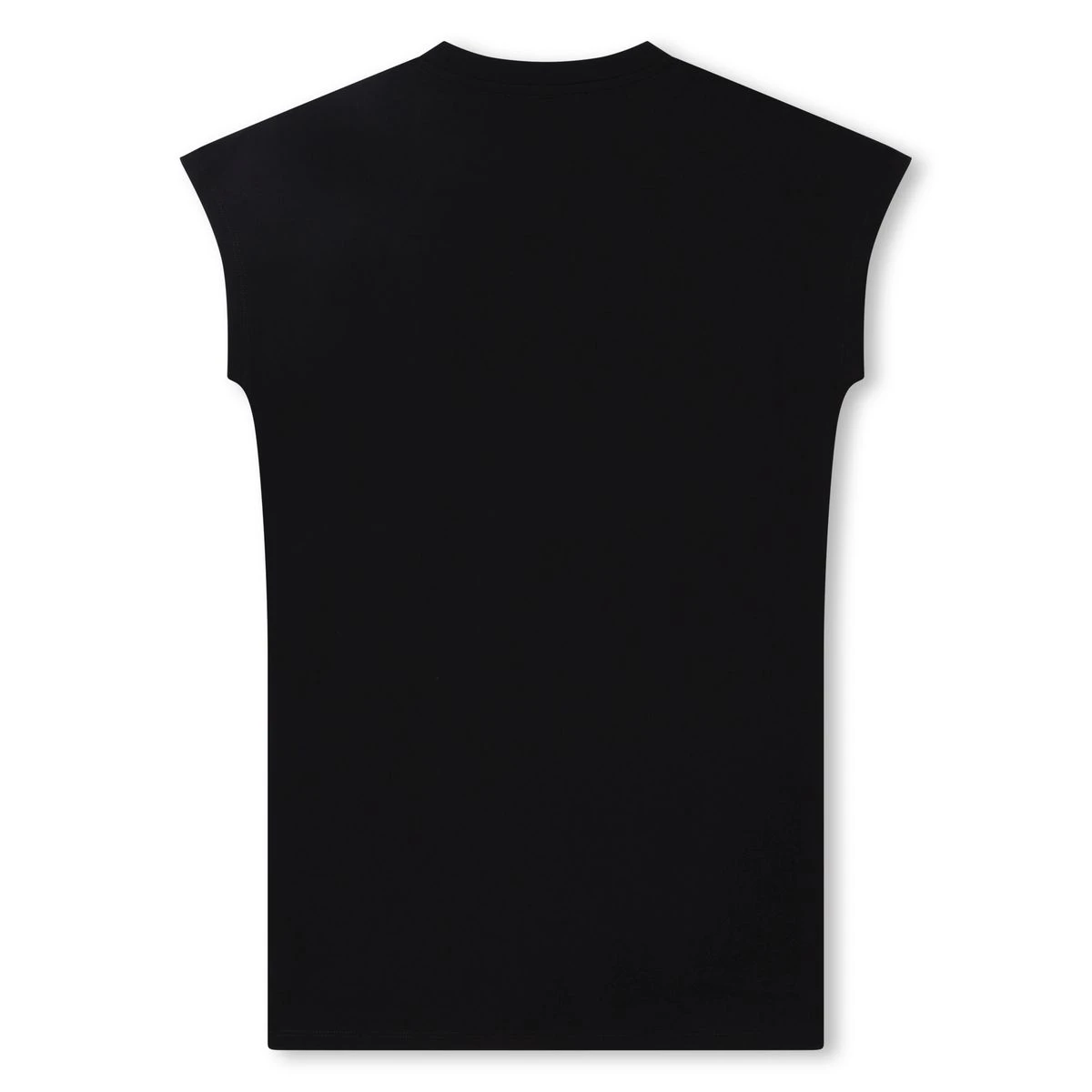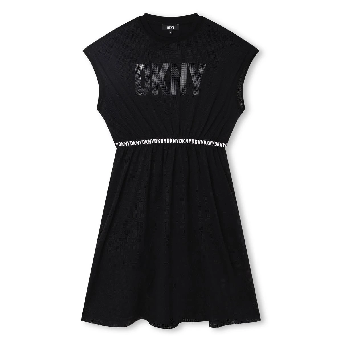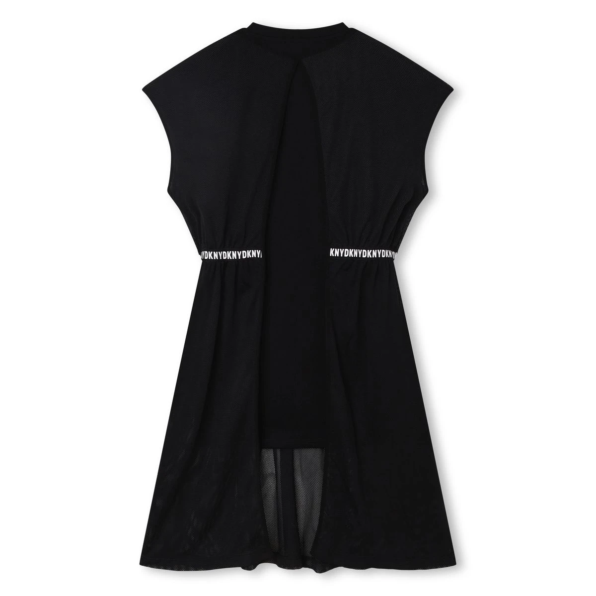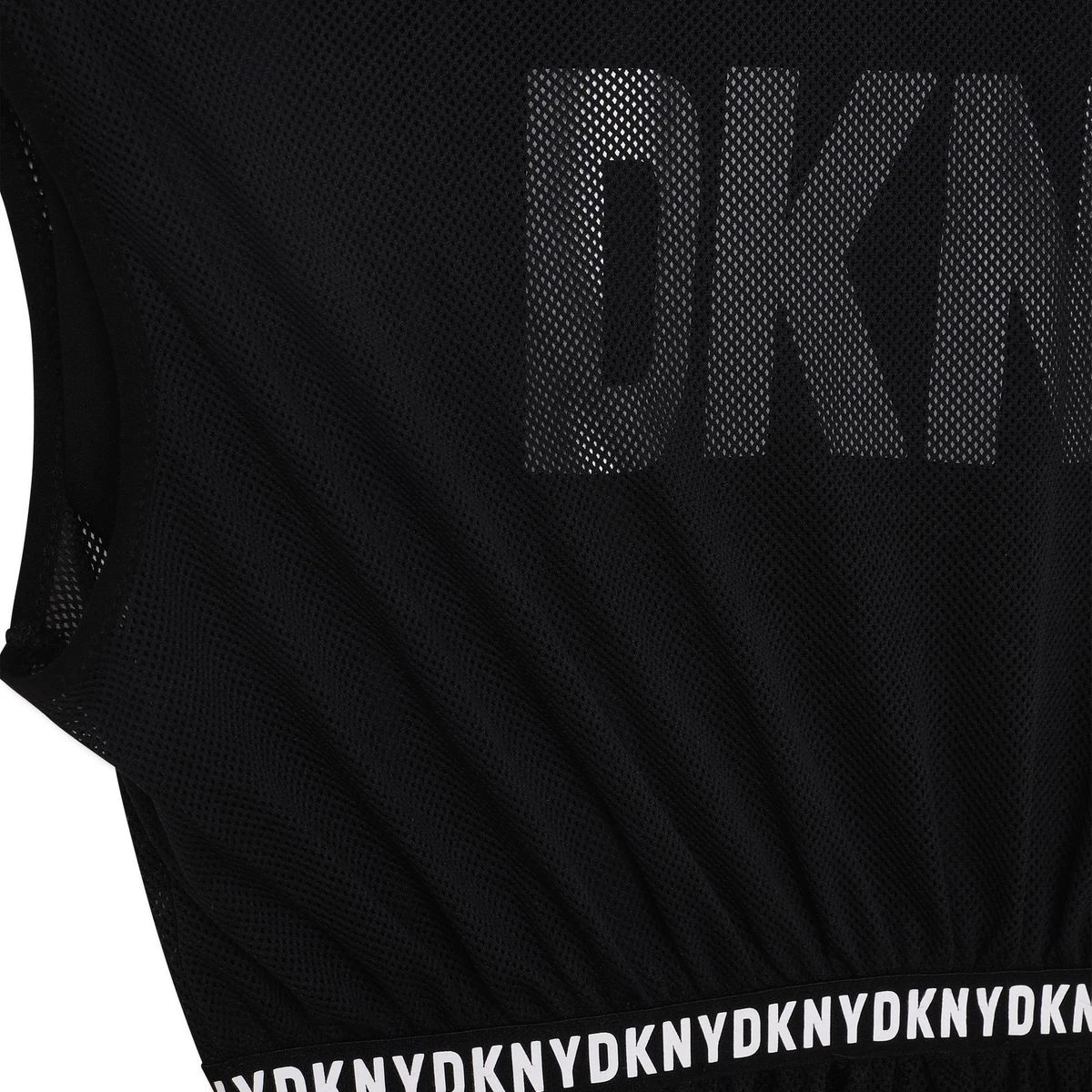 Cette robe DKNY à mancherons joue sur les textures en plus de son style 2-en-1. La robe T-shirt dessous se pare du logo DKNY devant. La sur-robe en résille possède une fente au dos. Un élastique siglé DKNY cintre la taille.