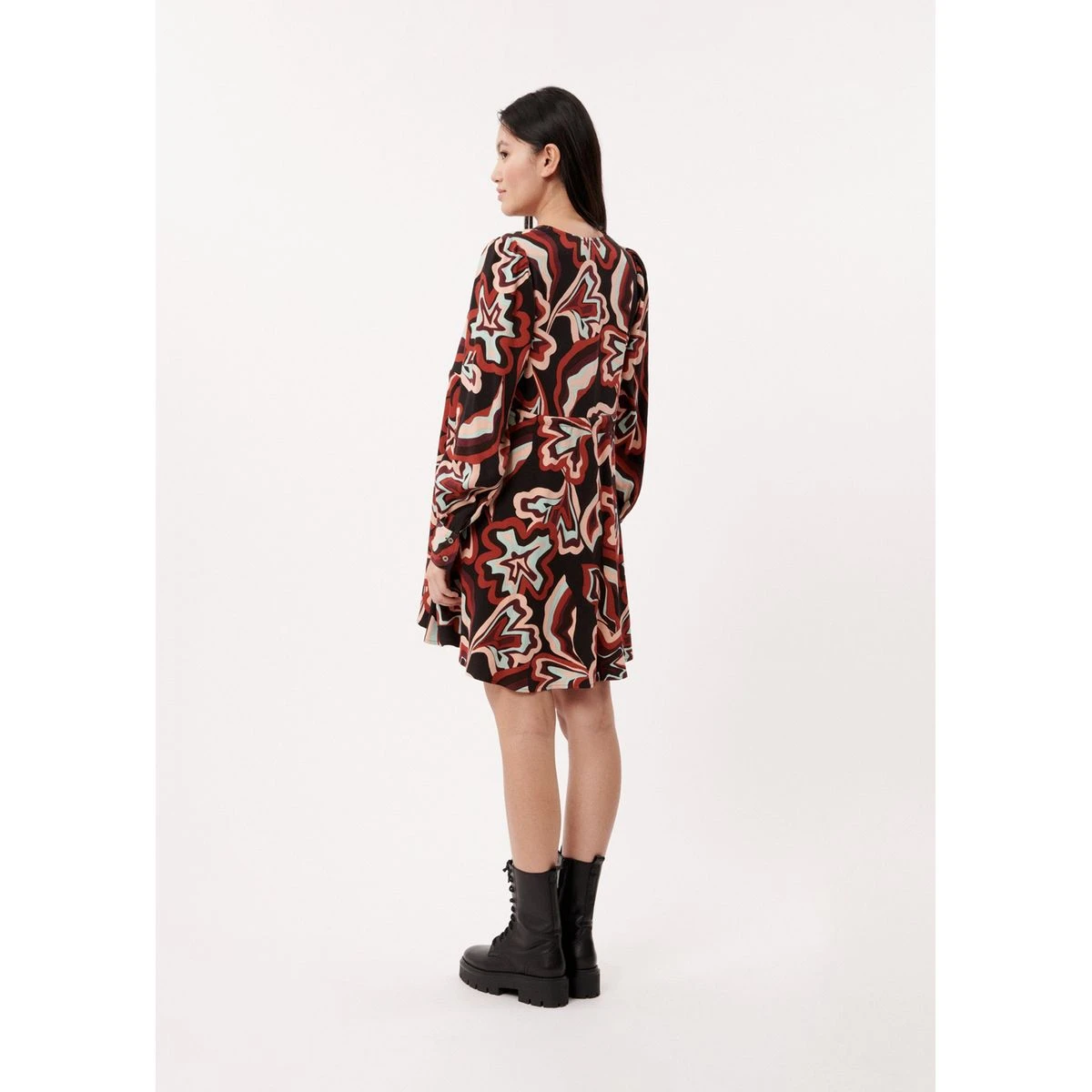 Abegail mesure 1m72 et porte une taille S. La robe a une longueur dos de 87,5 cm, une largeur épaule de 35 cm et une longueur manches de 66 cm. Elle a un tour de poitrine de 48 cm.