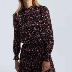 Robe courte en viscose et polyamide dévoré. Col collerette, manches longues élastiquées. Imprimé Cherry rock exclusif IKKS, doublure unie. Taille élastiquée avec smocks, fermeture par zip invisible dos. Longueur de robe : 91 cm pour une taille 36. Coupe droite, forme housse.