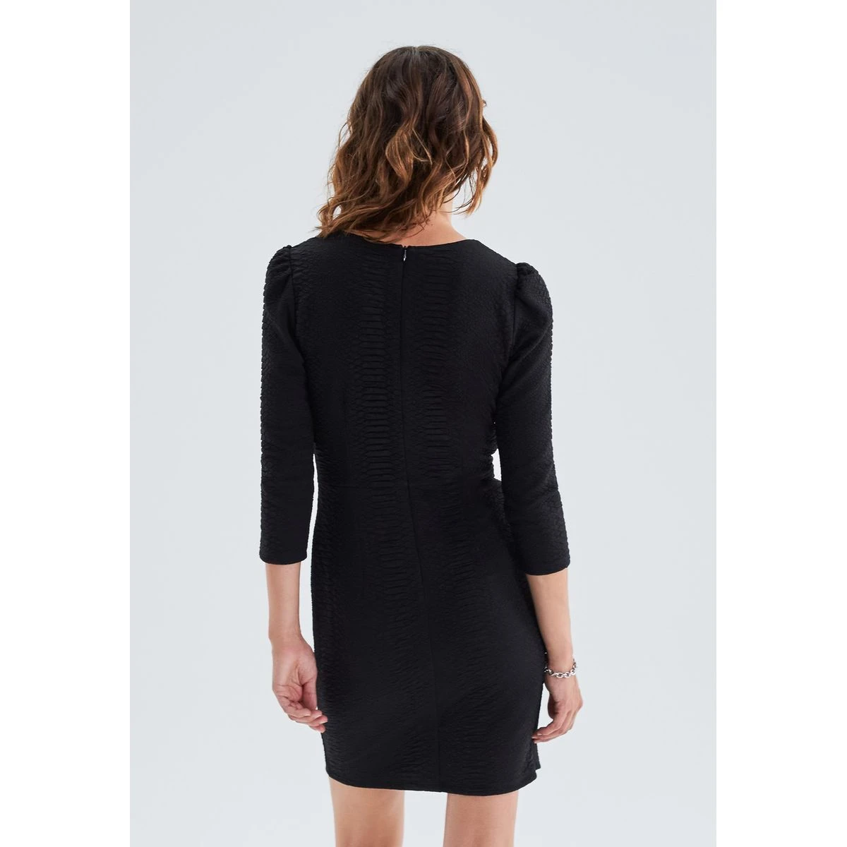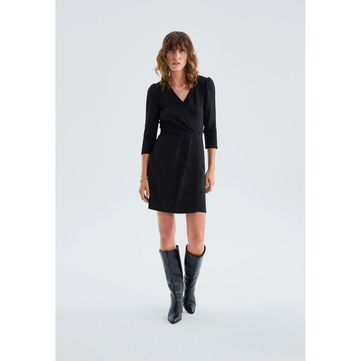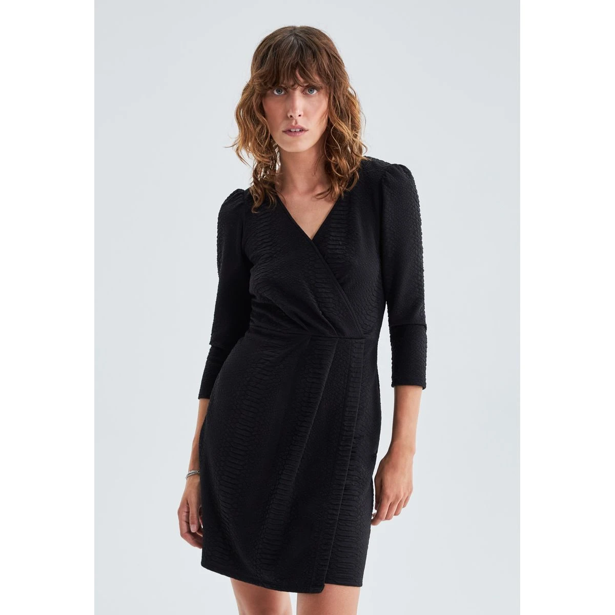 Robe portefeuille en polyester et spandex. Encolure en V, manches 7/8e. Maille jacquard à motif python, fronces aux épaules. Fermeture par pression cachée devant et zip invisible dos. Coupe ajustée, près du corps. Longueur de robe : 91 cm en taille 36.