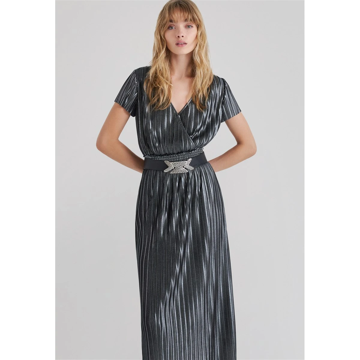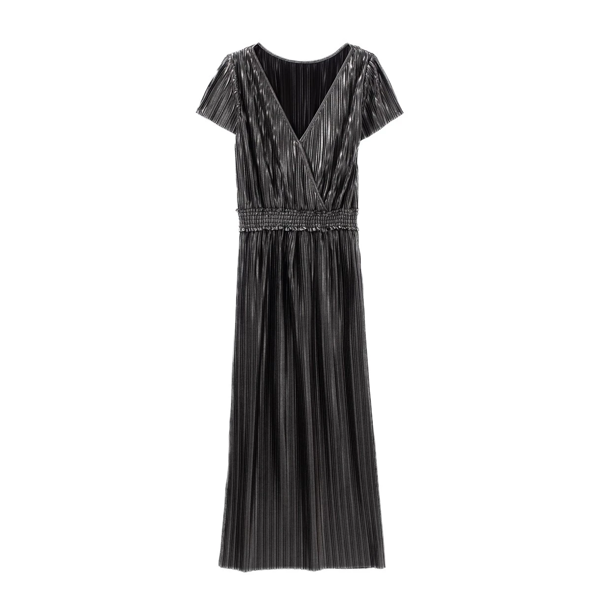 Robe longue en polyester. Encolure en V sur forme cache-coeur, manches courtes Jeux de plis, taille élastiquée avec smocks. Coupe droite et fluide. Longueur de robe : 140 cm pour une taille 36.