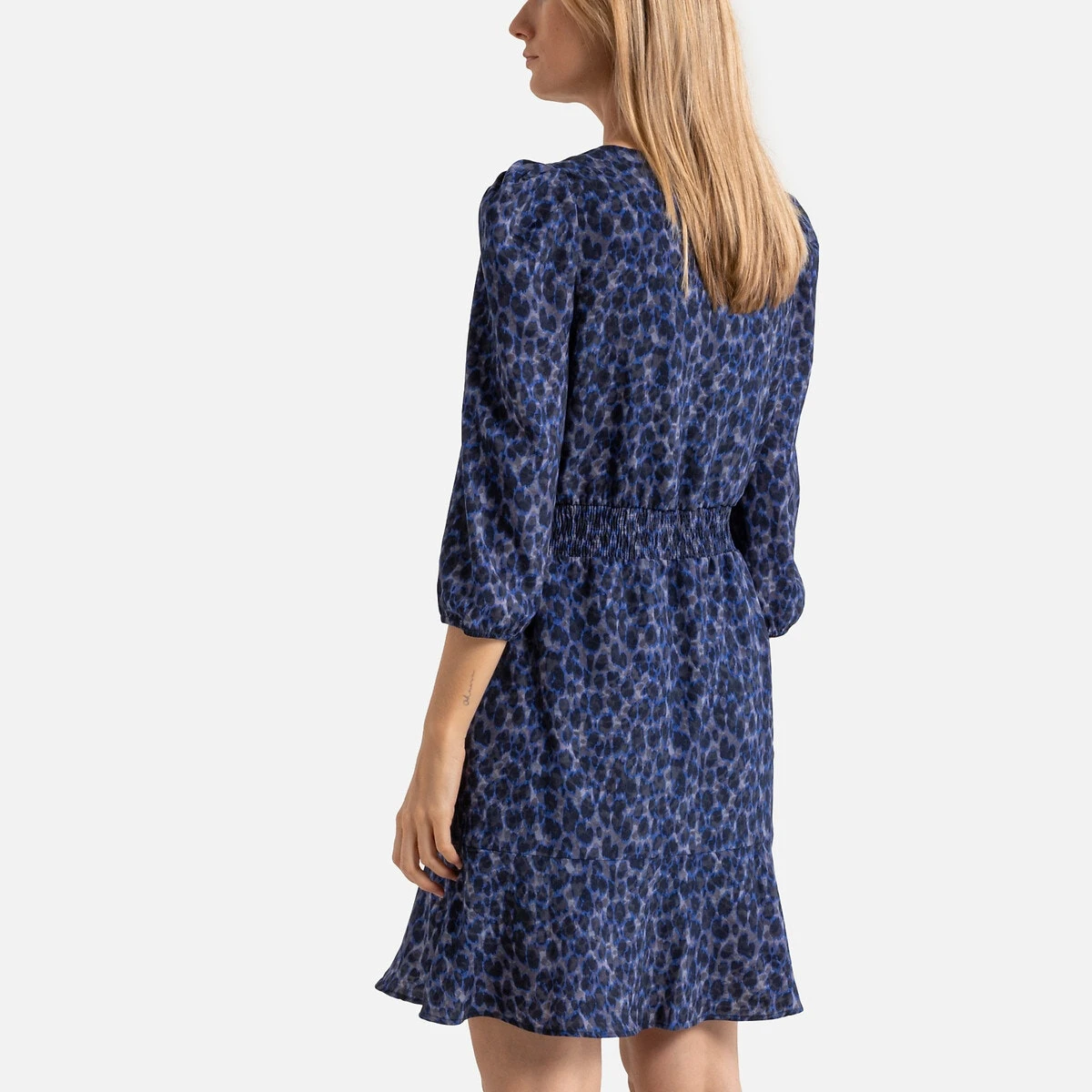 Robe en crêpe marocain de polyester. Encolure en V, manches 3/4 élastiquées. Imprimé tachiste exclusif IKKS, doublure unie. Taille élastiquée avec large bande smockée, découpe bas de robe pour volume. Détail de fronces aux épaules. Coupe droit et fluide. Longueur de robe : 91 cm pour une taille 36. IKKS #actforbetter : matière contenant 100% de polyester recyclé.