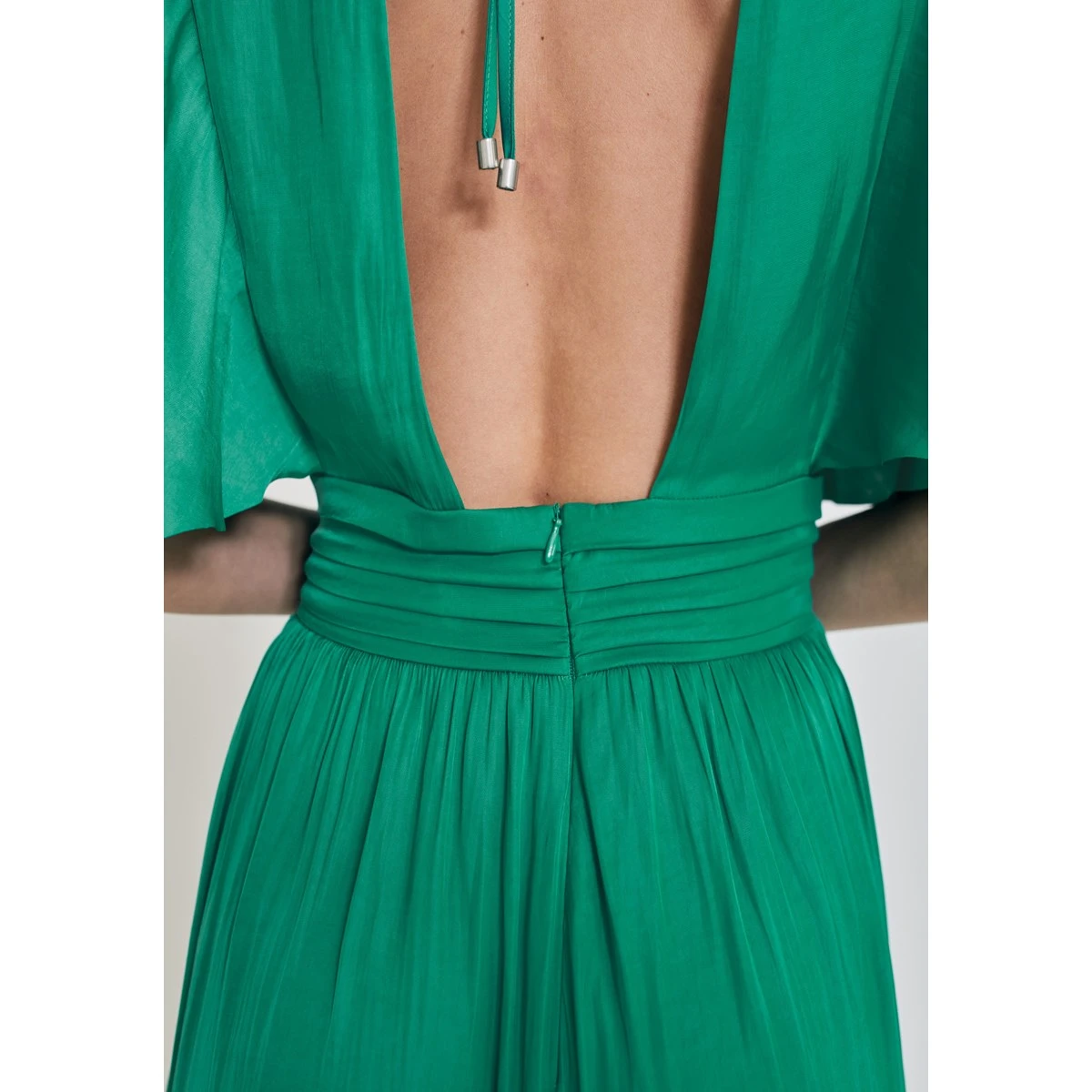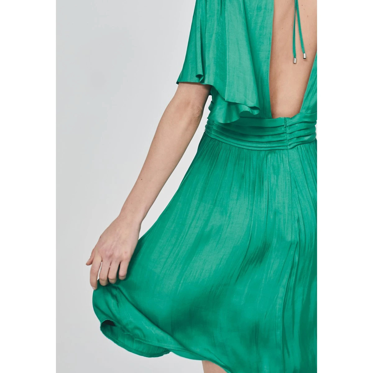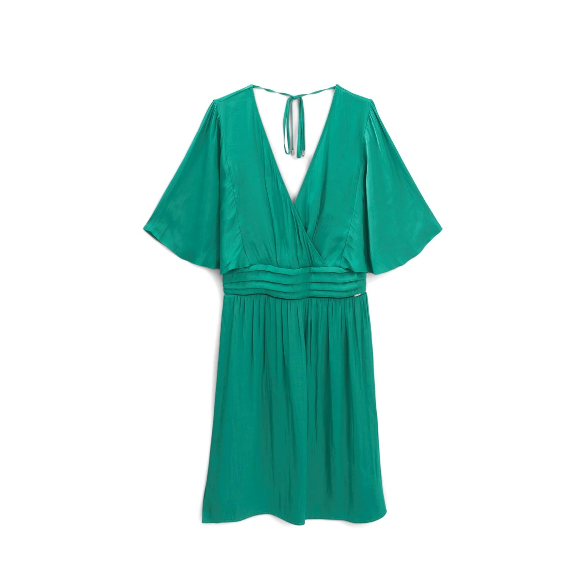 Robe en polyester encolure V, manches courtes volantées. Découpe taille avec large drapé à la ceinture. Dos ouvert avec liens à nouer. Fermeture par zip invisible au dos. Longueur : 92 cm IKKS #actforbetter : matière contenant 100% de polyester recyclé. Mariage, naissance, anniversaire, cette robe vous habille en un clin d’oeil. Imaginée pour une cérémonie, elle se porte de préférence avec une jolie paire de sandales à talon et un sac pochette à la main.