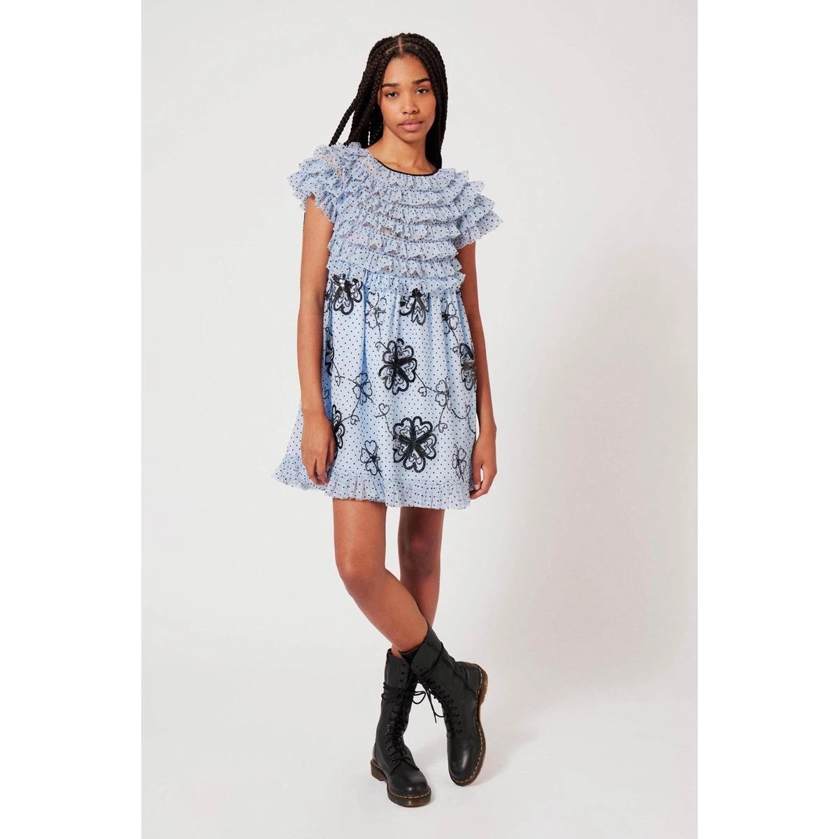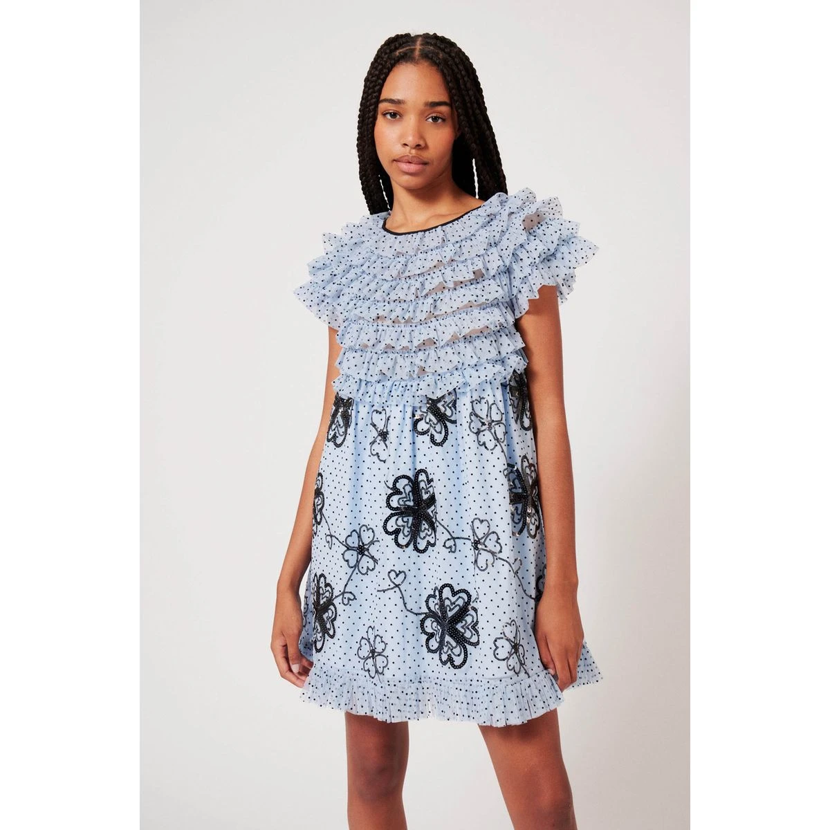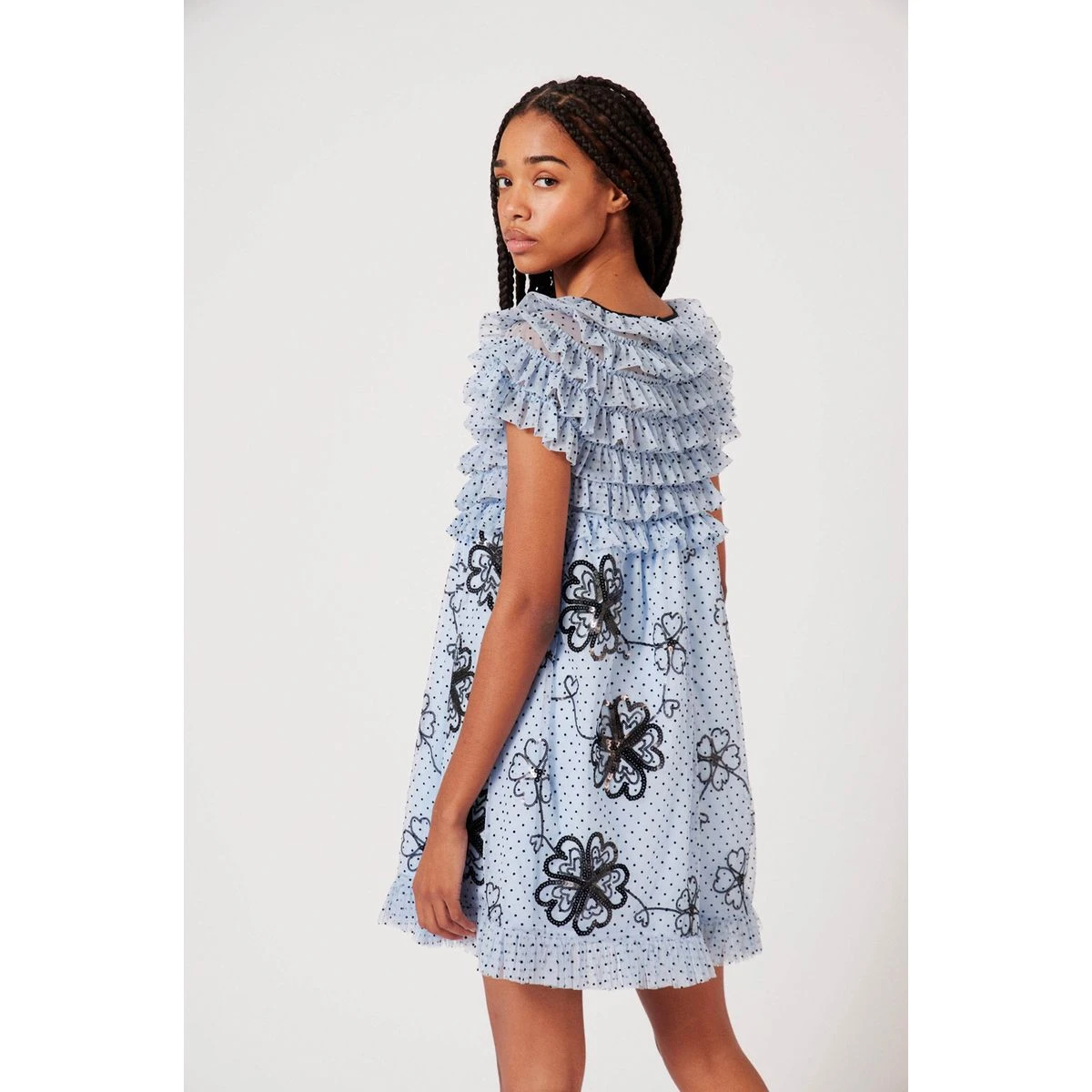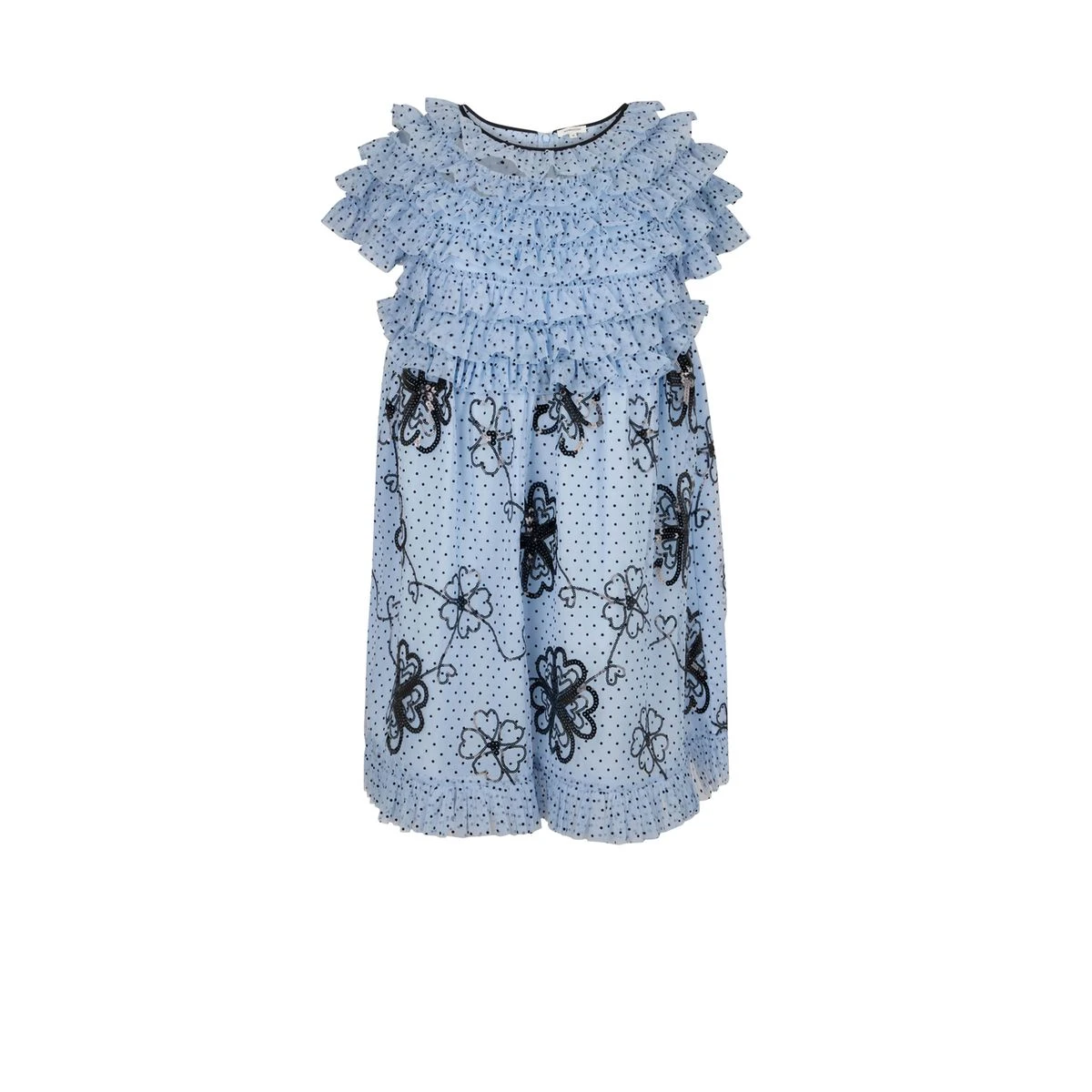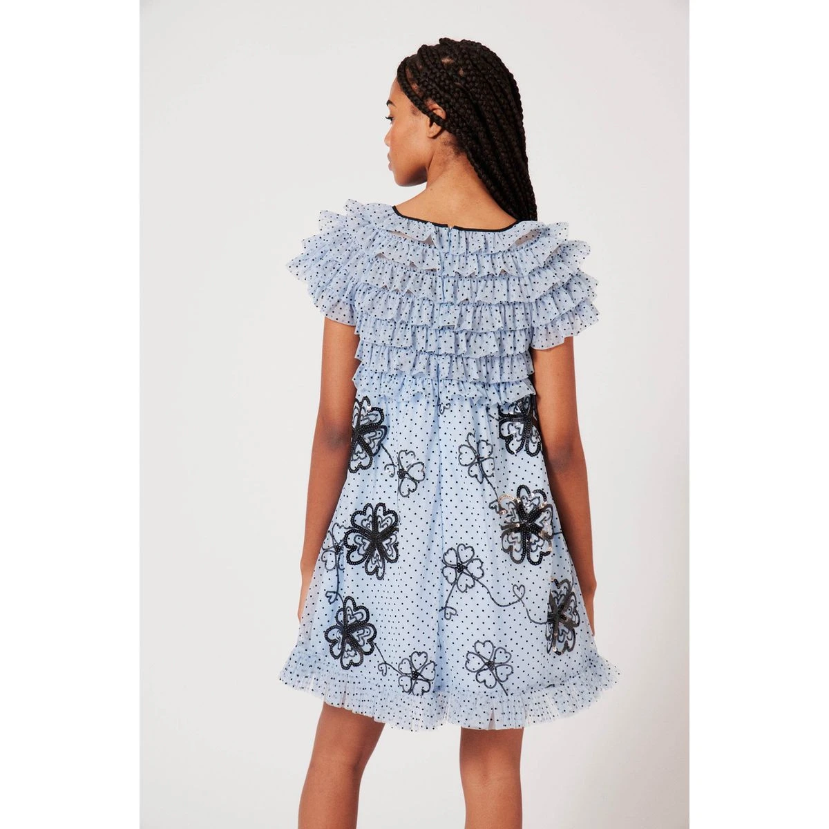 Robe volantĂ©e doublĂ©e Ă manches courtes. Motif Ă pois et Ă fleur en sequins. Effet de transparence des volants sur le haut du vĂŞtement. Fermeture Ă l’arrière par zip invisible.