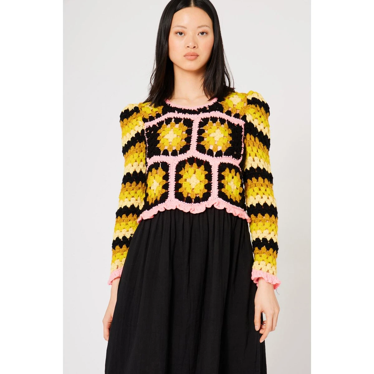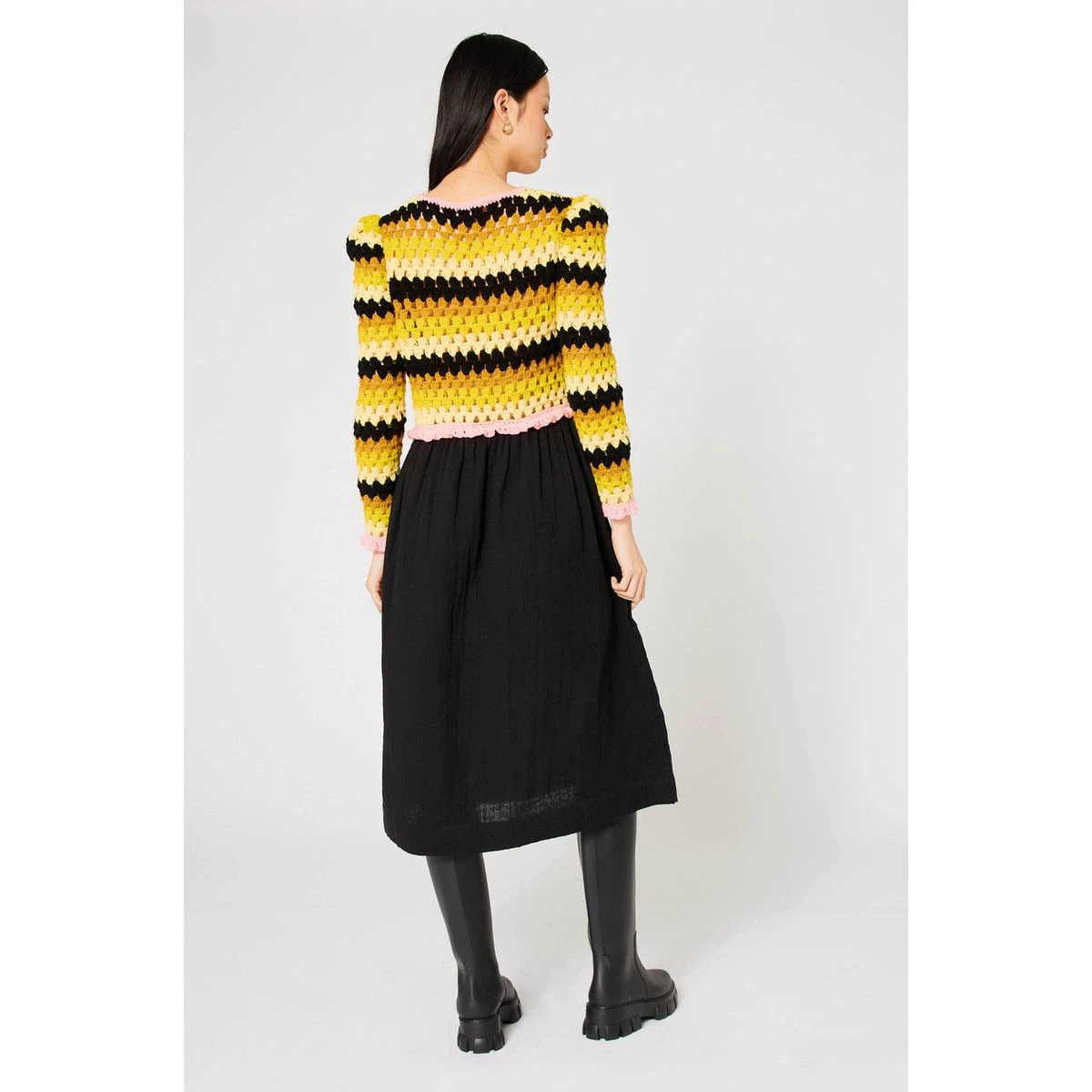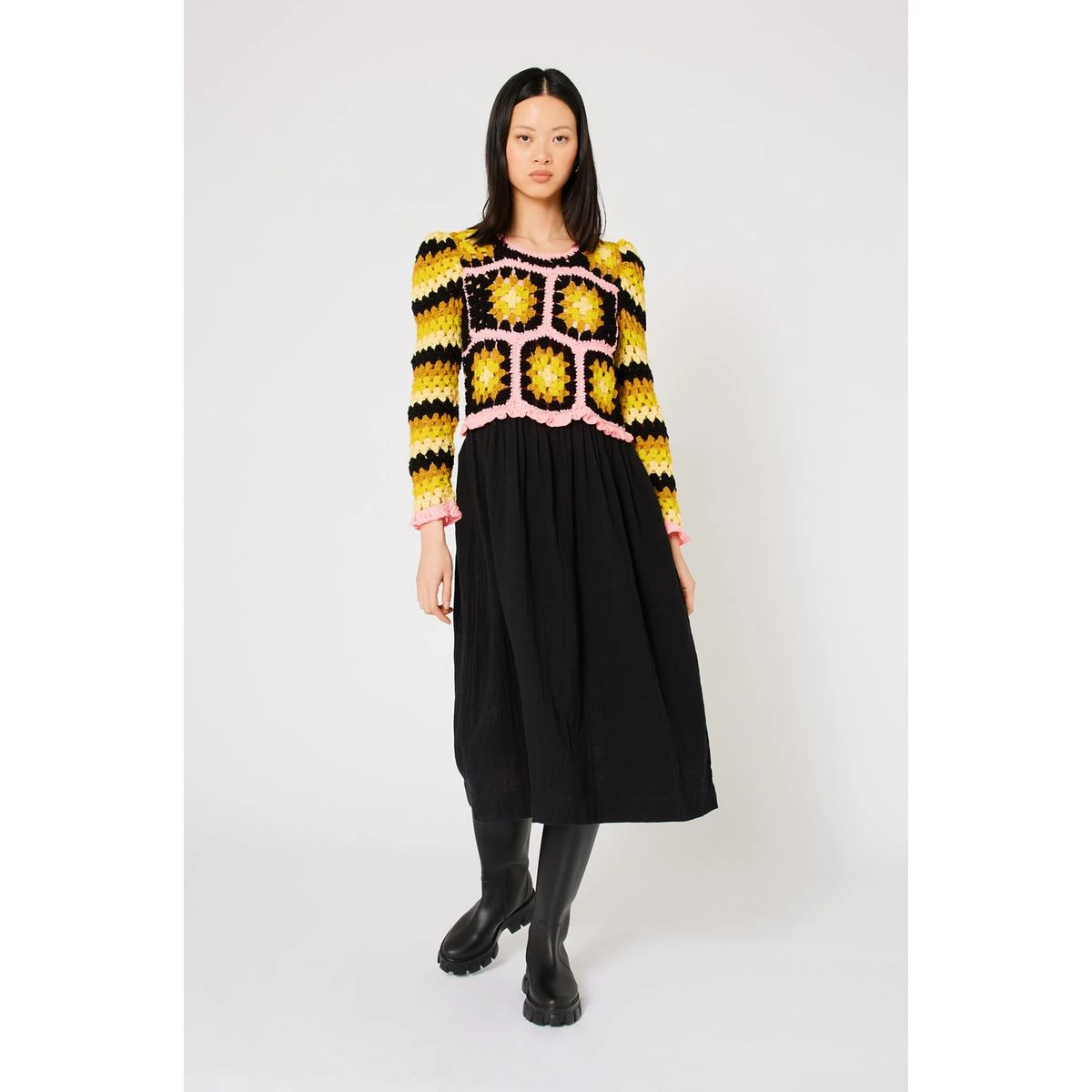 Robe longue avec jupon noir en coton. Haut de robe entièrement réalisé au crochet. Col carré. Manches longues. Finitions à froufrou rose.