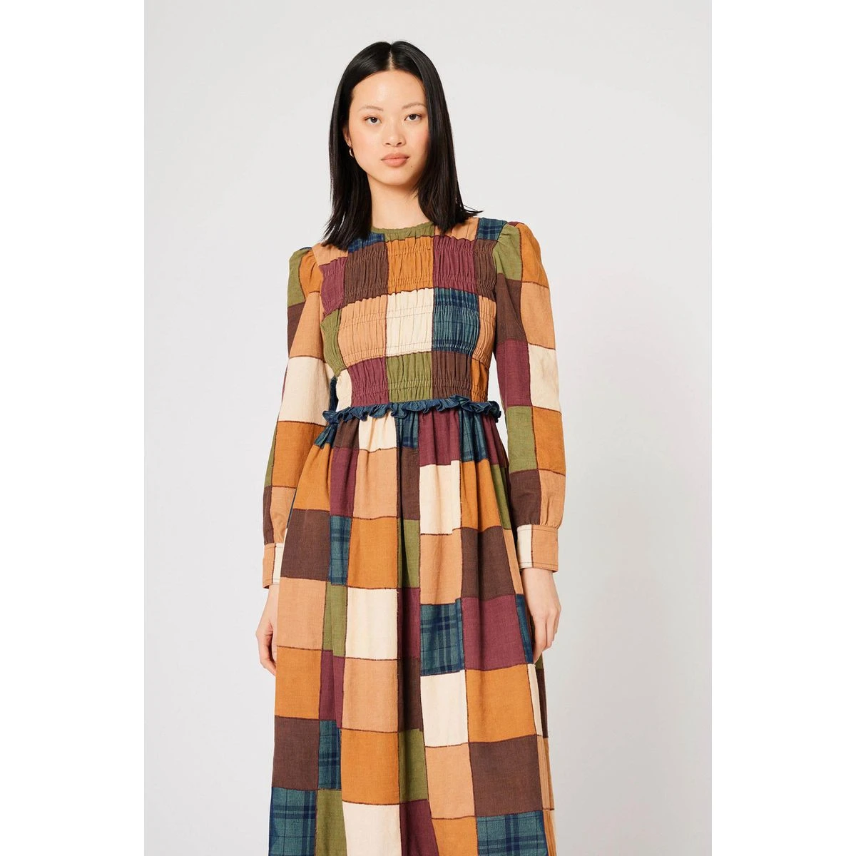 Robe longue patchwork en velours avec surpiqûres. Smocks sur le devant. Fermeture zippée au dos. Col rond. Petits volants à la taille. Manches longues à manchettes avec fermeture à bouton. Chaque pièce Damier Velours est unique, le placement du patchwork peut différer de la photo présentée sur l’eshop.