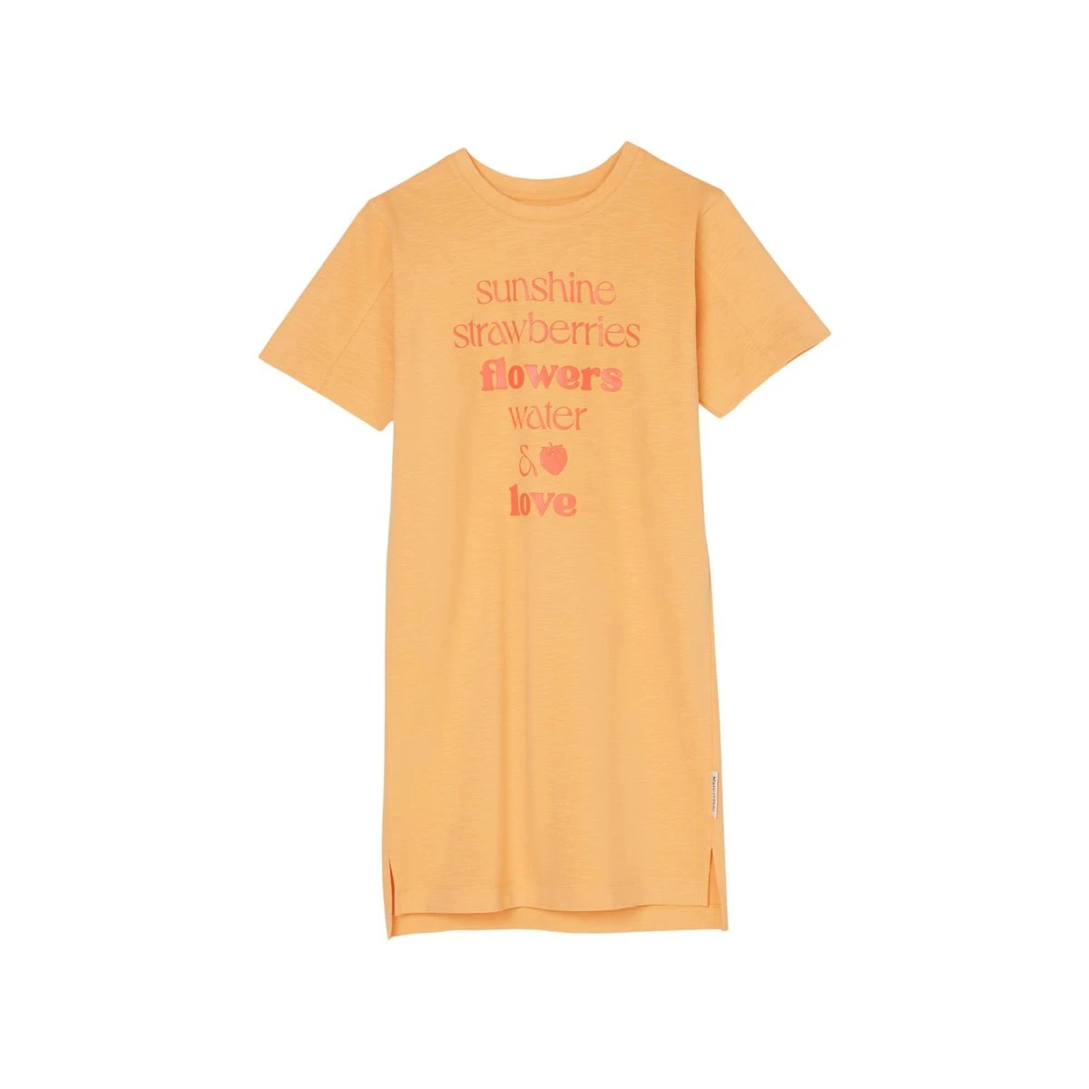 Rayons du soleil, fraises, fleurs : la robe estivale fraîche en pur coton biologique dans une agréable matière en jersey lourd arbore un imprimé 3D cool de couleur contrastante.