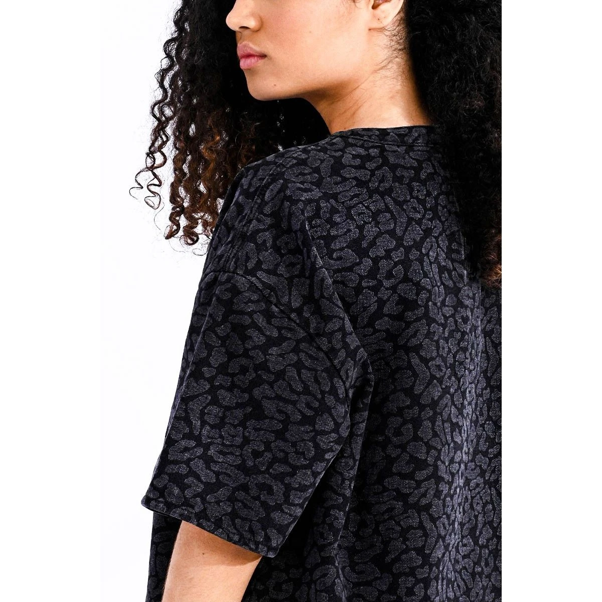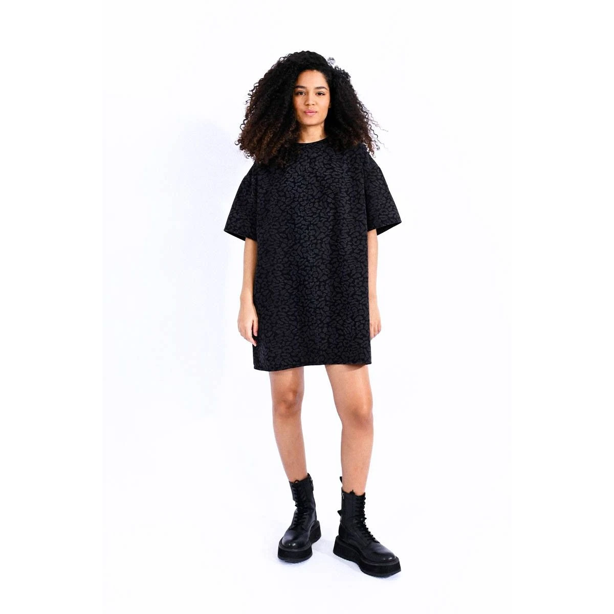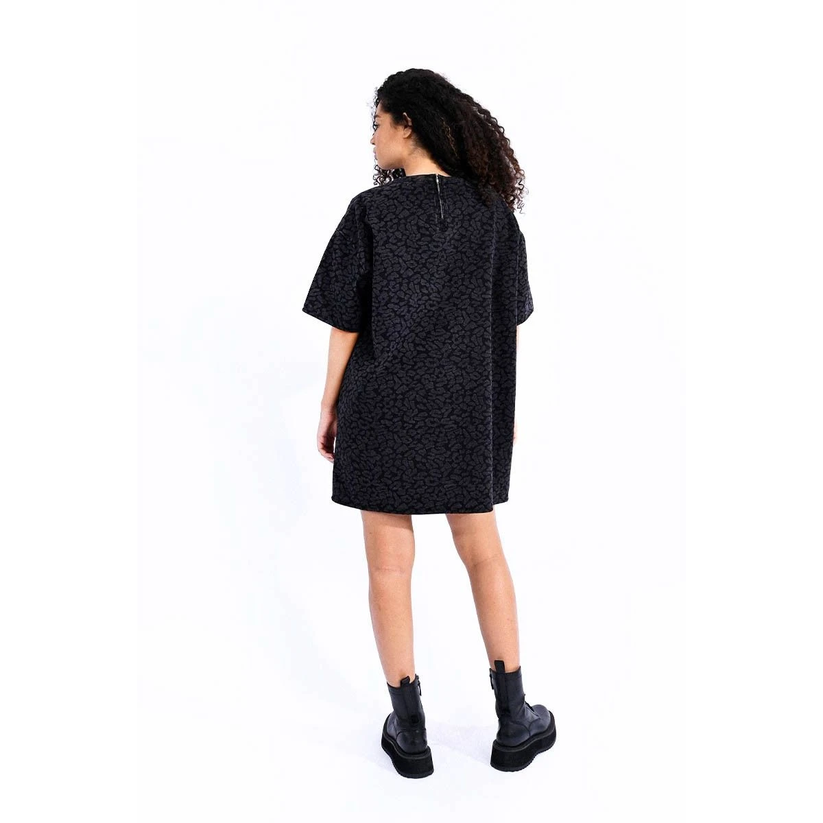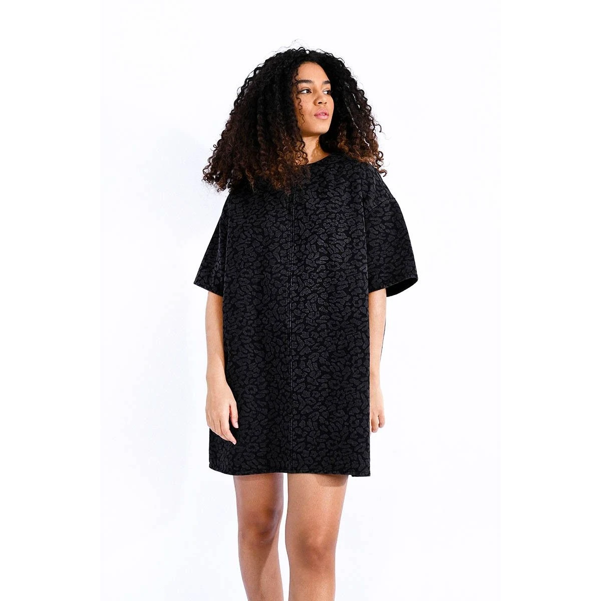 Robe loose et courte en jean imprimé léopard, petit zippé dans la nuque, emmanchure basse et courte. Longueur : 85cm Taille S