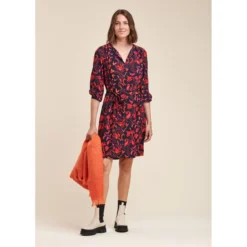 Détails du Produit : Robe courte à imprimé fleuri, encolure ronde avec goutte boutonnée, manches longues avec poignets boutonnés, découpes épaules avec fronces, découpe dos avec fronces, bas de robe légèrement évasé, ceinture à nouer. Longueur : 95 cm.