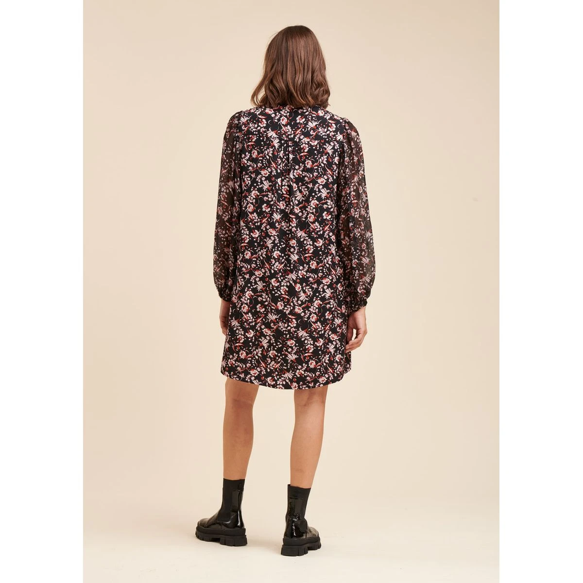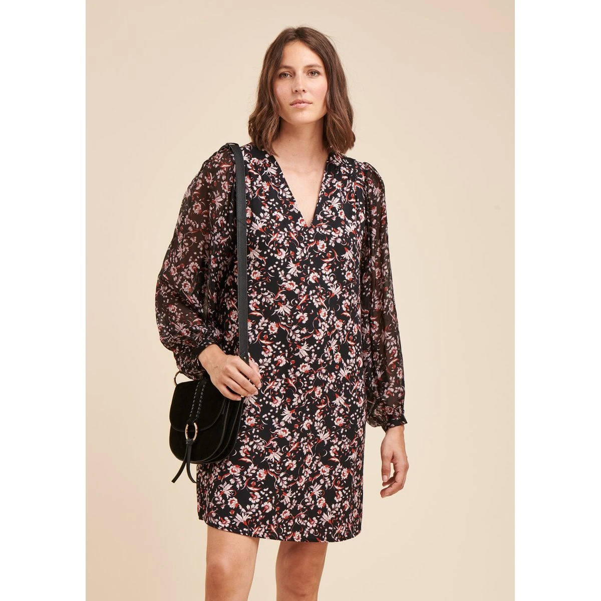 Détails du Produit : Robe courte bi-matière à imprimé fleuri, encolure V, manches longues et amples en voile de viscose soie avec bracelets boutonnés, découpes épaules avec fronces, découpe dos avec fronces, coupe droite. Longueur : 92 cm.