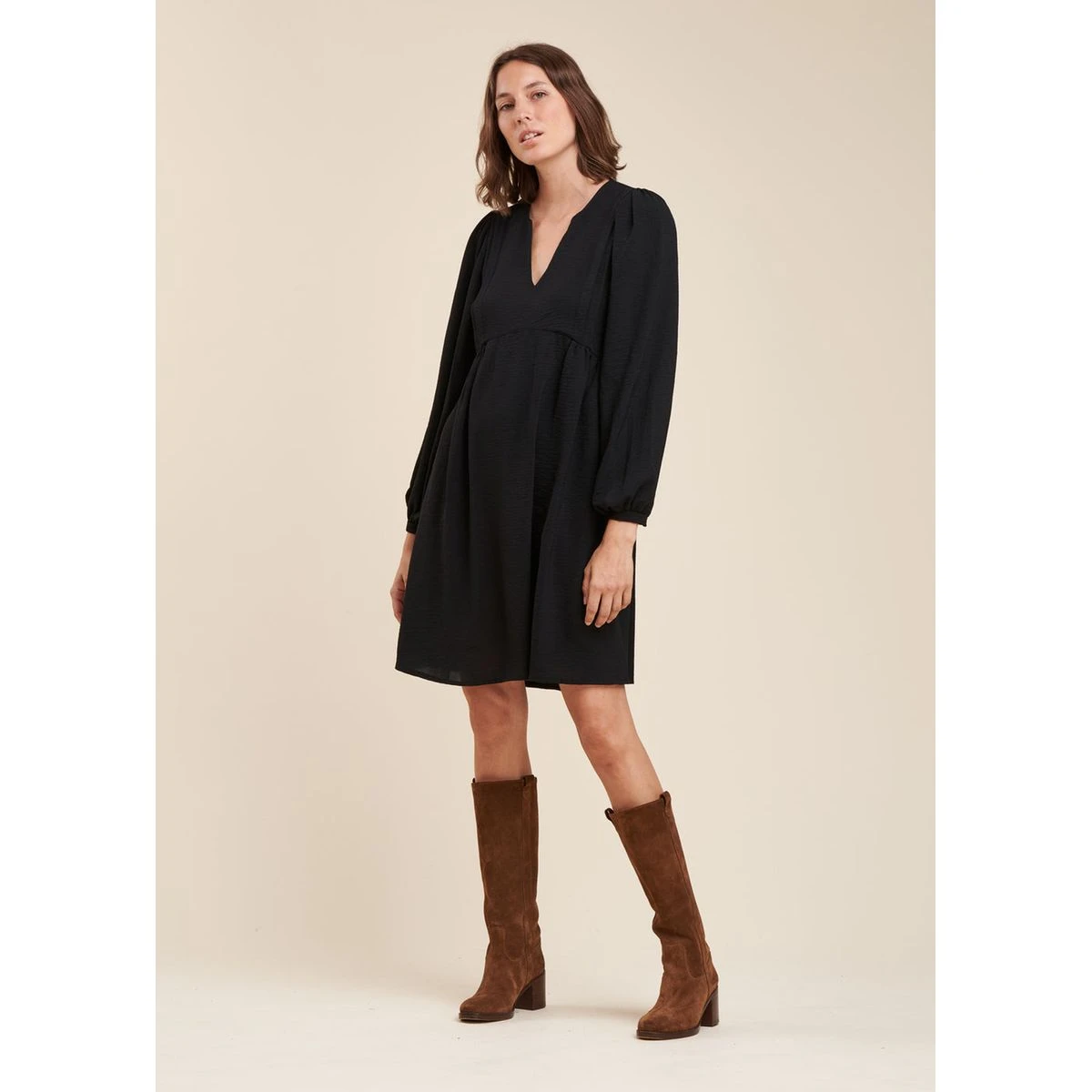 Détails du Produit : Robe courte coupe ample, encolure V, manches longues bouffantes avec bracelets, découpes bretelles avec deux larges plis, découpe taille avec fronces, découpes bretelles dos. Longueur : 95 cm.