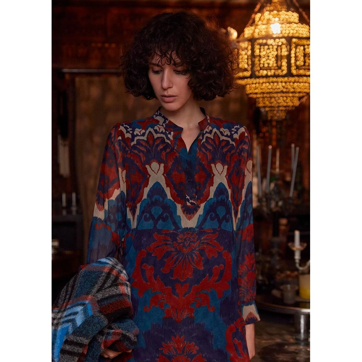Détails du Produit : Robe courte imprimée en viscose écoresponsable Ecovero, encolure tunisienne boutonnée, manches longues avec poignets boutonnés, coupe droite. Longueur : 95 cm.