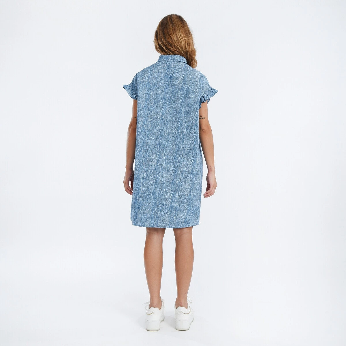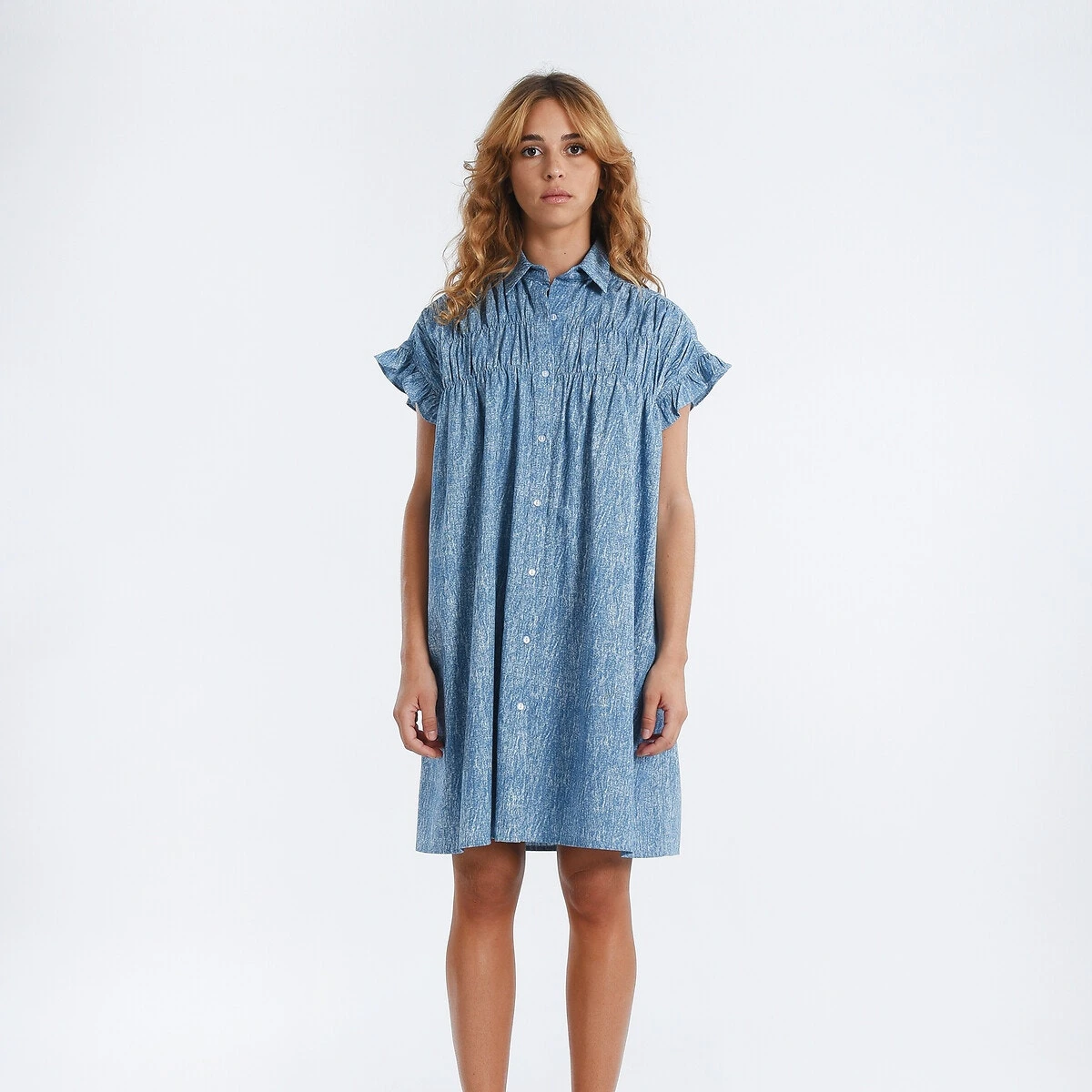 Robe droite boutonnée, manches courtes volantées bleu LILI SIDONIO