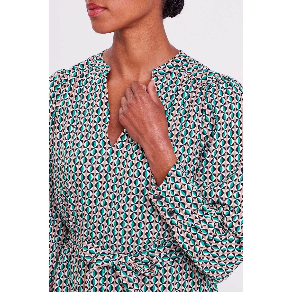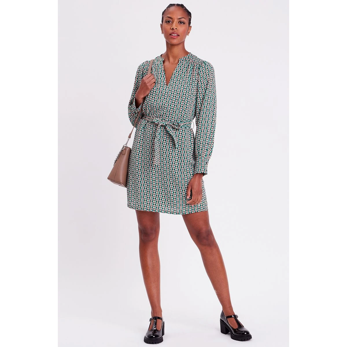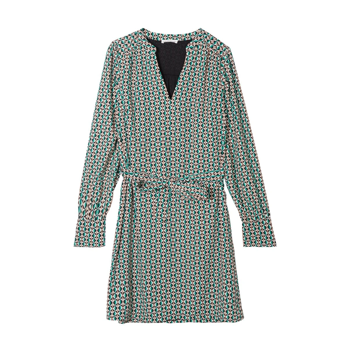 Robe droite ceinturée Coupe droite fluide Courte Col en V Manches longues Taille à passants Ceinture à nouer Le + mode : sa ceinture nouée à la taille
