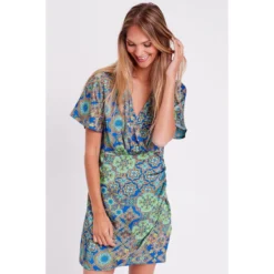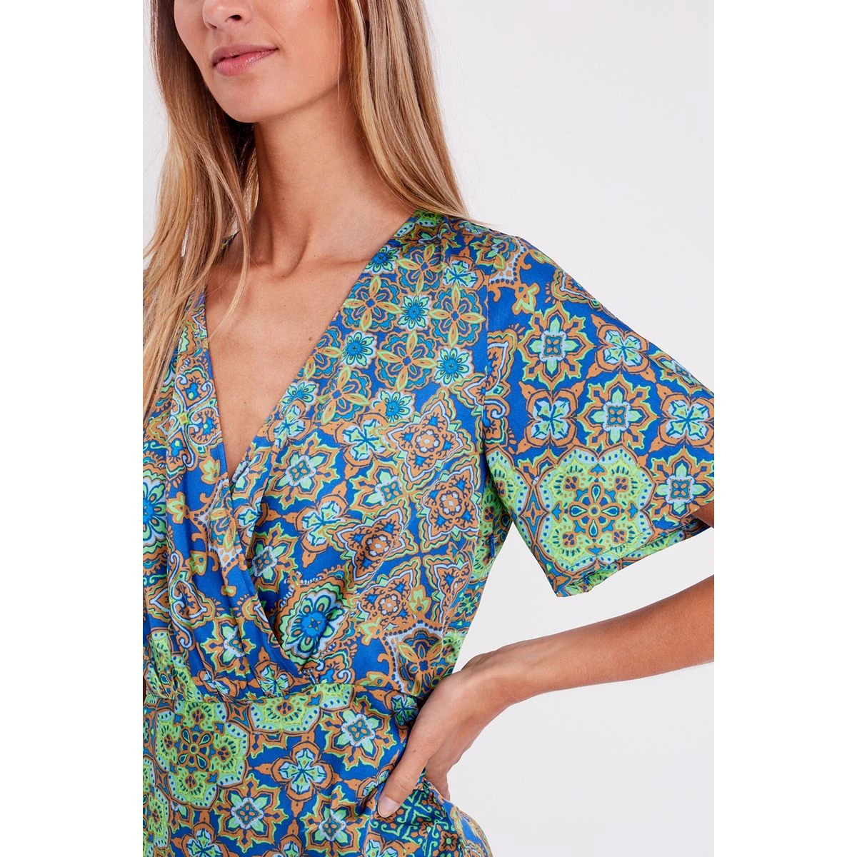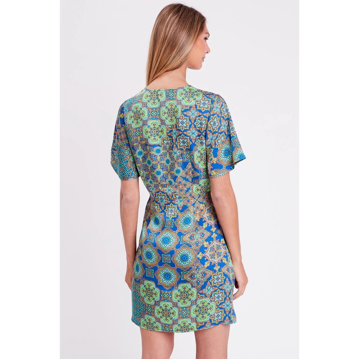 Robe droite drapée satin Coupe droite Courte Col cache-coeur Manches courtes Aspect satin Effet drapé Manches amples