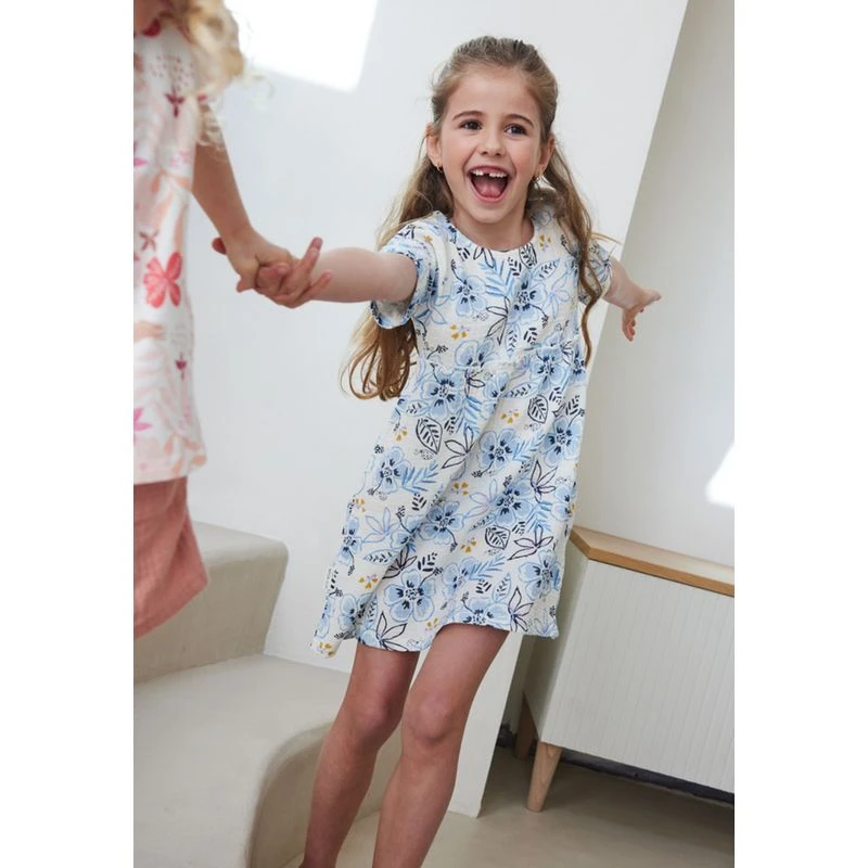 Wahou ! On ne sait pas vous, mais nous on l’adore déjà ! Cette robe apportera beaucoup de charme à la tenue de votre fille avec ses jolies fleurs bleues, sa petite touche dorée, et son subtil volant à la taille. En plus, elle sera super facile à associer avec une petite paire de baskets ou de sandalettes. Une matière agréable en coton gaufré De petits volants à la taille
