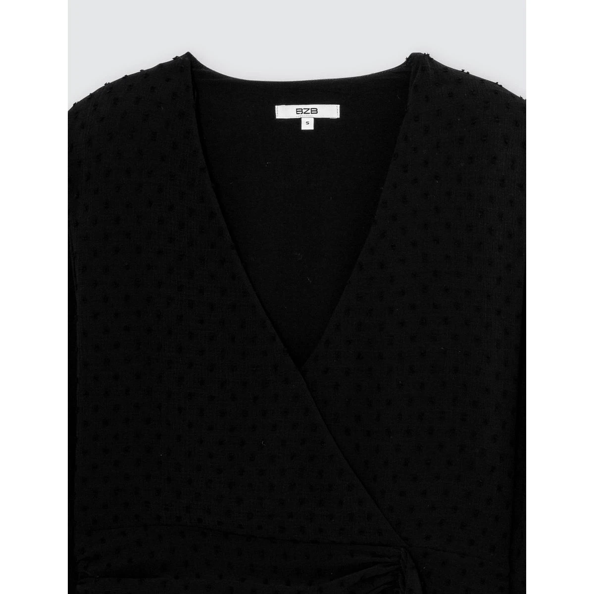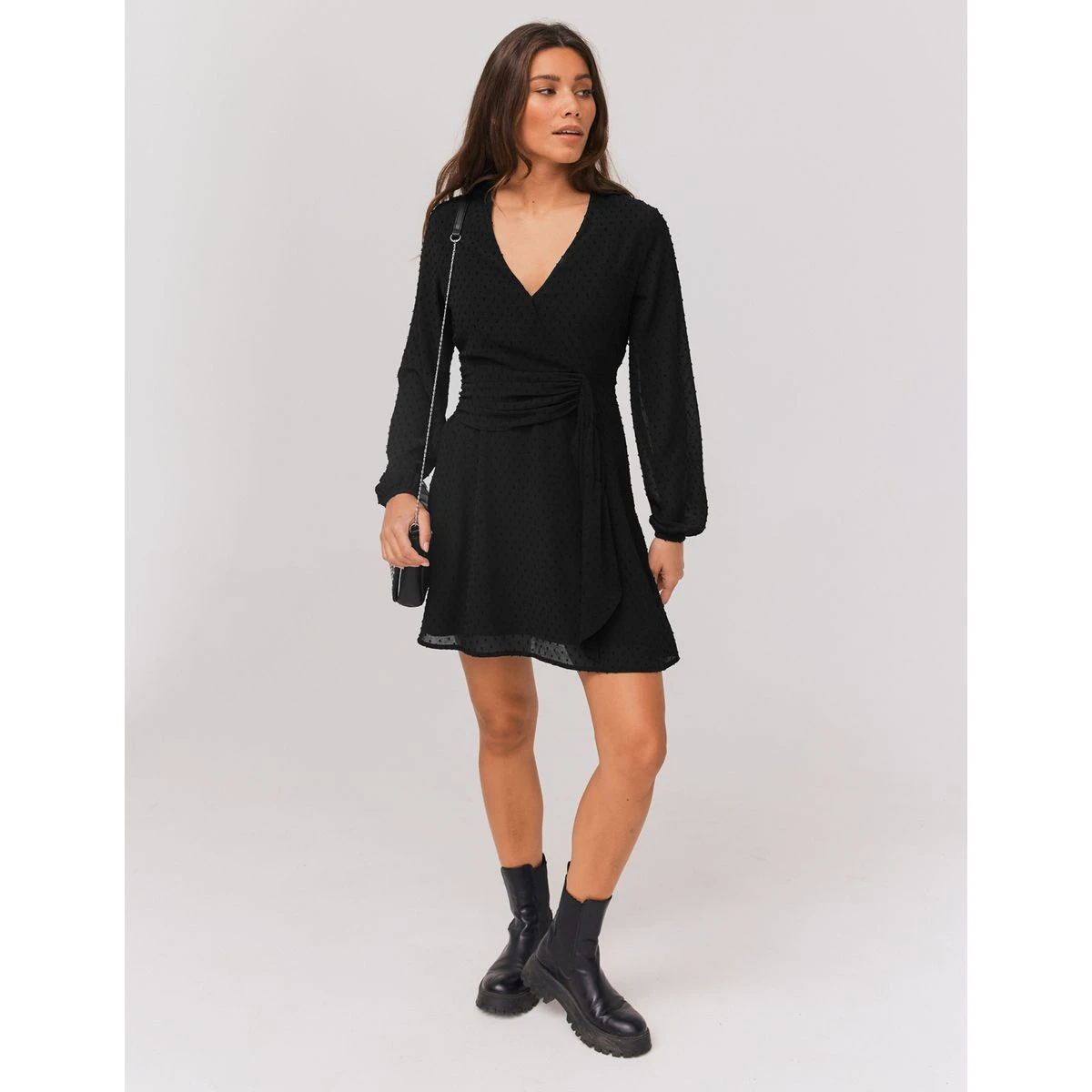 Robe courte portefeuille texturĂ©e – Robe plumetis – Manches longues – Forme cache coeur – Ceinture fantaisie drapĂ©e sur le devant – Fermeture Ă©clair invisible sur le cĂ´tĂ© TAILLE ET COUPE – Coupe droite – La mannequin porte une taille S