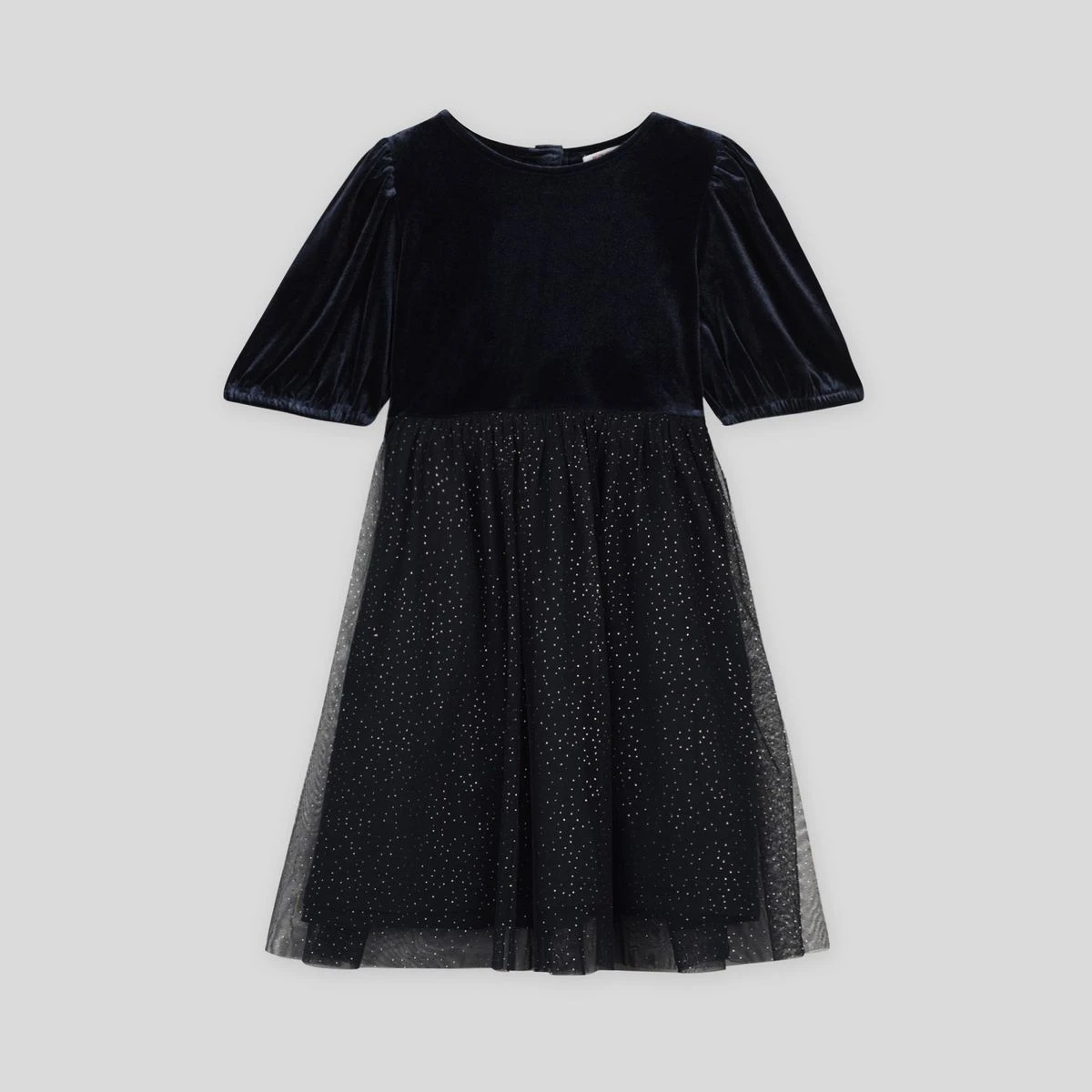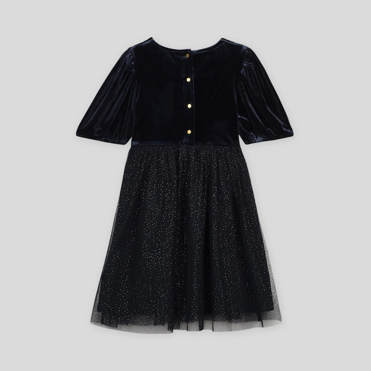 – Robe en velours et en tulle – Col rond – Manches ballons – Tulle pailletée – Doublure 100% coton – Fermeture partiellement boutonnée dans le dos – Finition bord-côte – Numéro du modèle: H31790366