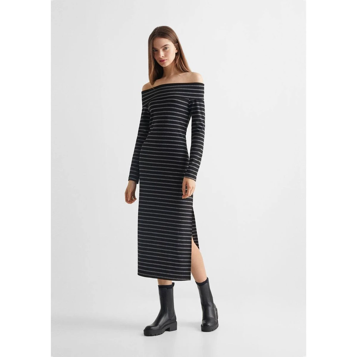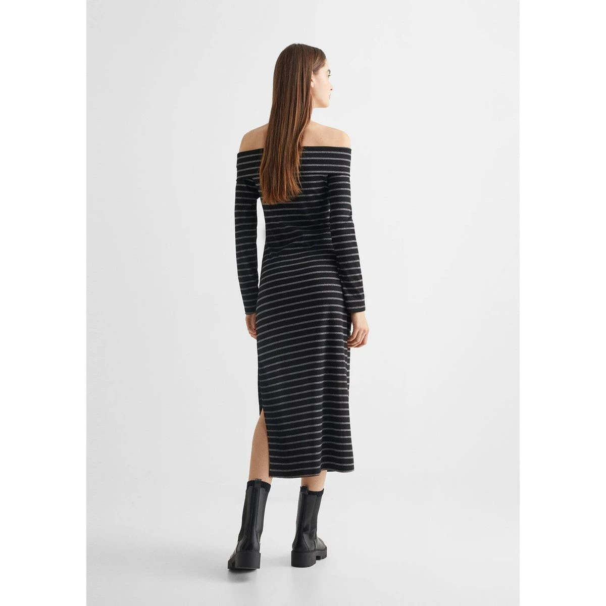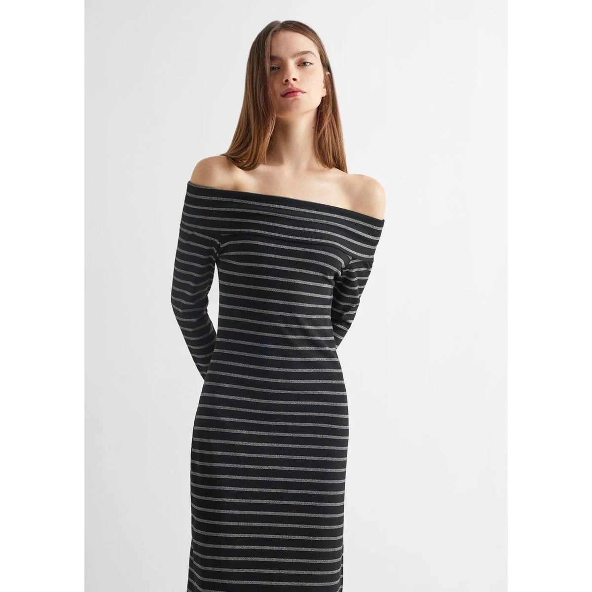 - Collection fêtes et cérémonies, Design épaules dénudées, Imprimé rayures, Épaules dénudées, Détail brillant, Coupe droite, Coupe midi, Fente latérale, Manches longues, Sans fermeture
