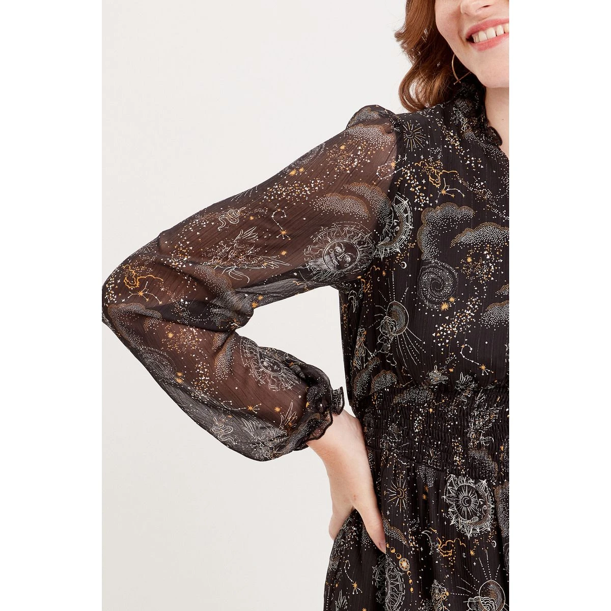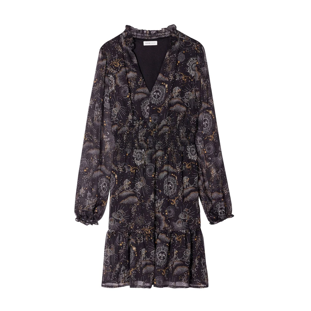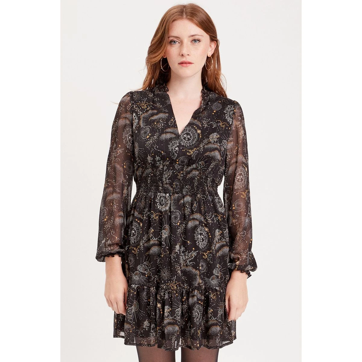 Robe évasée smockée Coupe évasée Courte Col en V Manches longues Taille smockée Empiècement volanté smocké au col Empiècements volantés aux poignets et sur le bas de la robe Le + mode : ses détails smockés