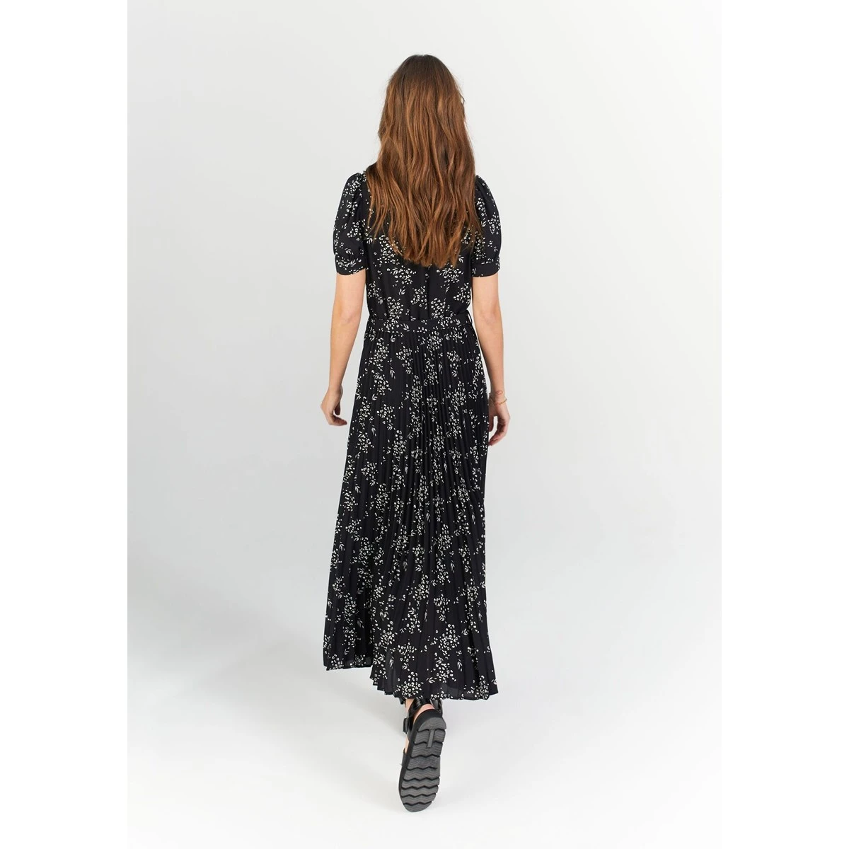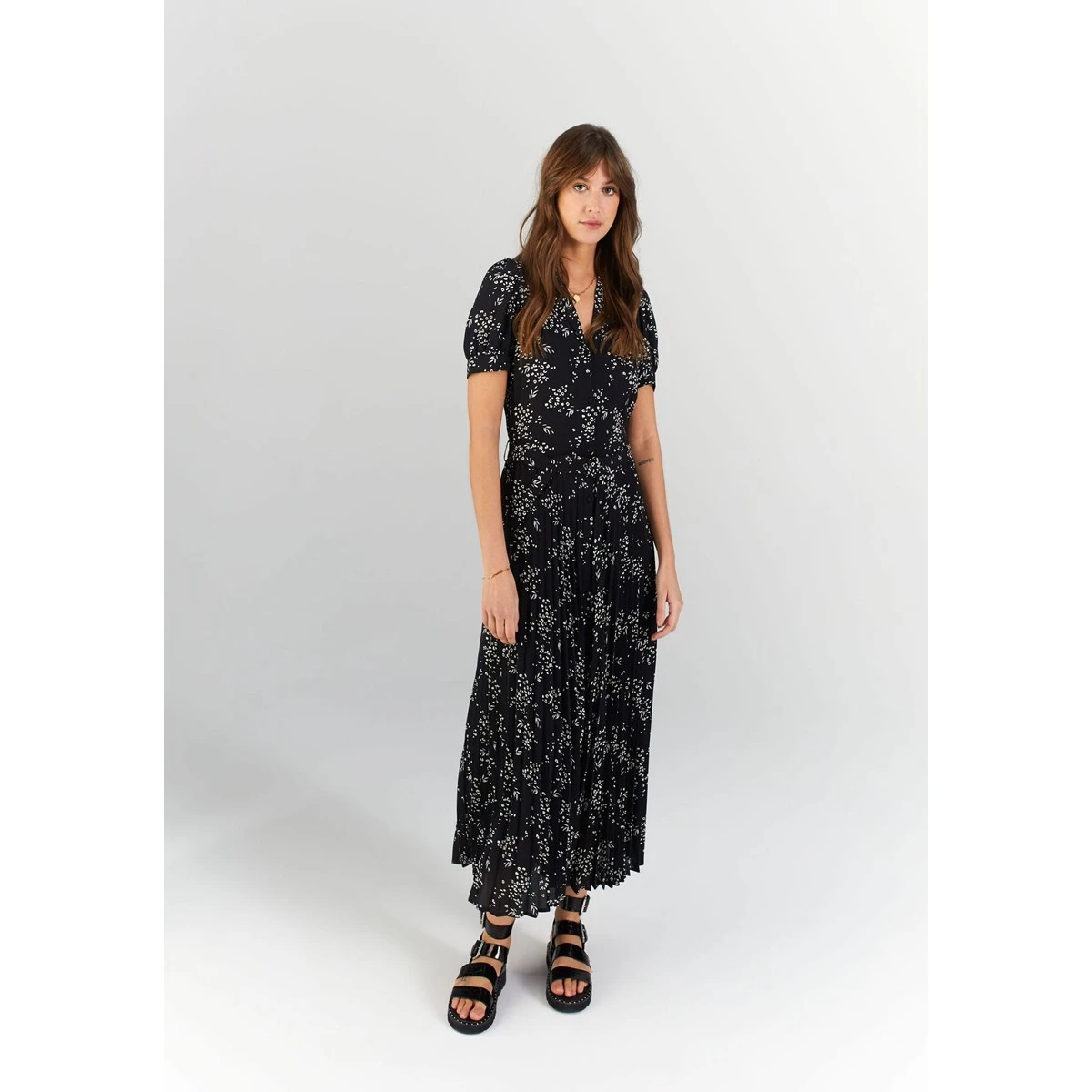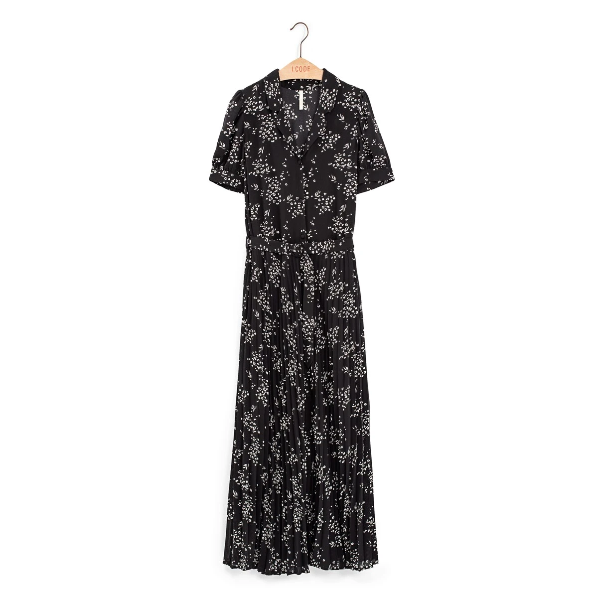 Robe longue évasée. Col tailleur, manches courtes forme ballon. Imprimé floral léopard exclusif, dessiné par I.Code. Découpe taille avec ceinture amovible. Bas plissé, avec doublure partielle. Fermeture par boutons devant. Longueur de robe : 127 cm.