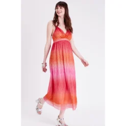 Robe longue évasée dos ouvert Coupe évasée Longue Col en V Bretelles fines Dos ouvert Détails fils métallisés