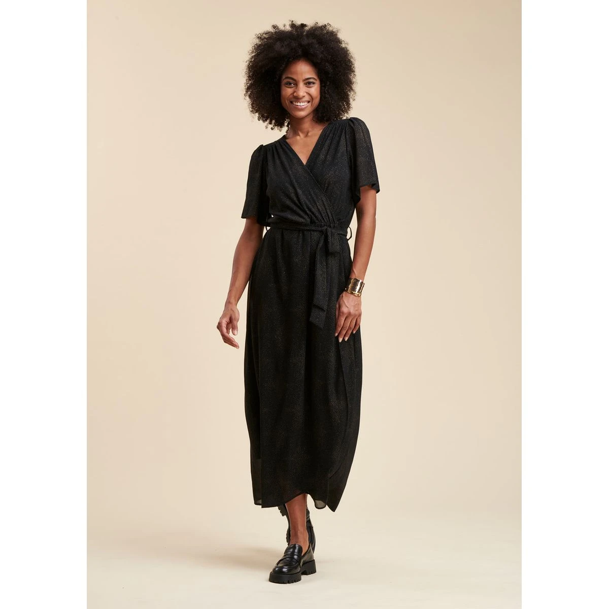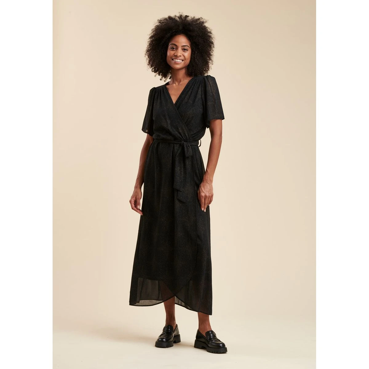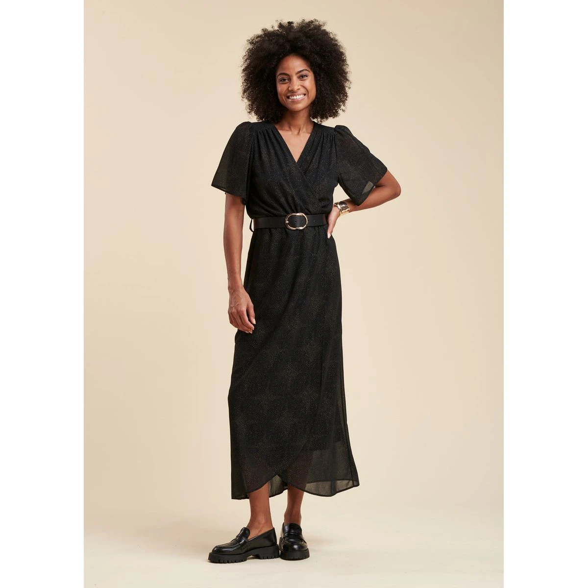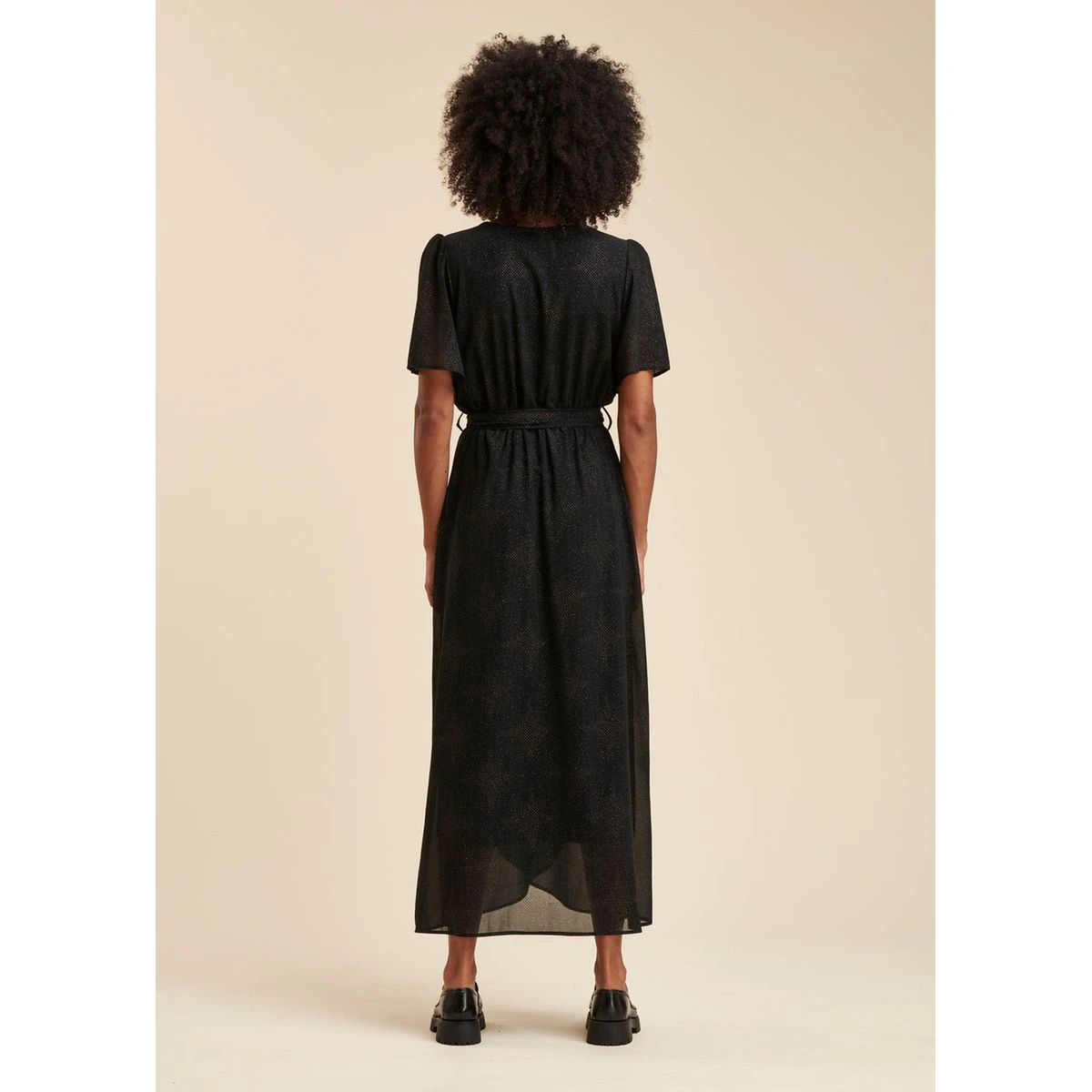 Robe longue faux portefeuille en voile imprimé pailleté noir LA FEE MARABOUTEE