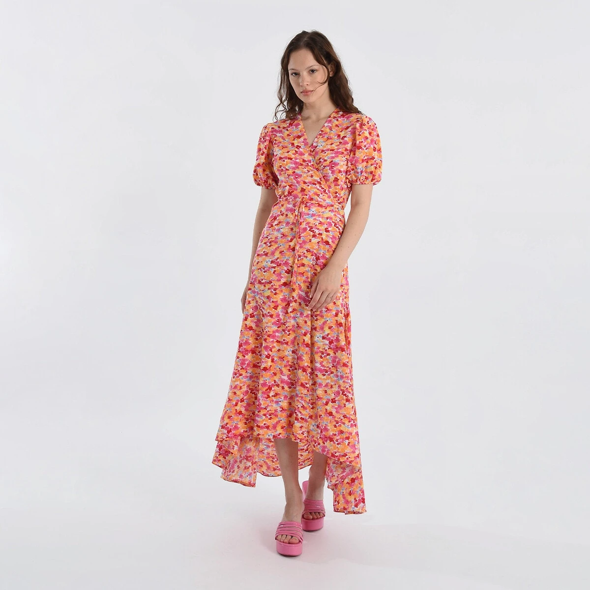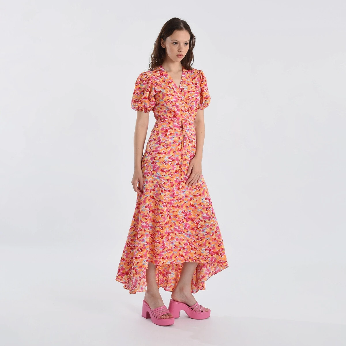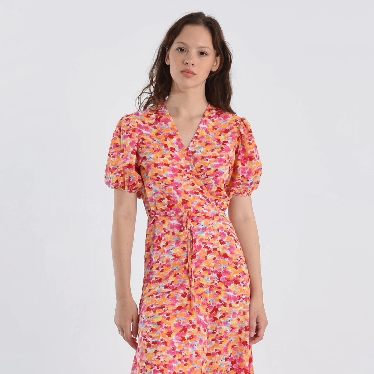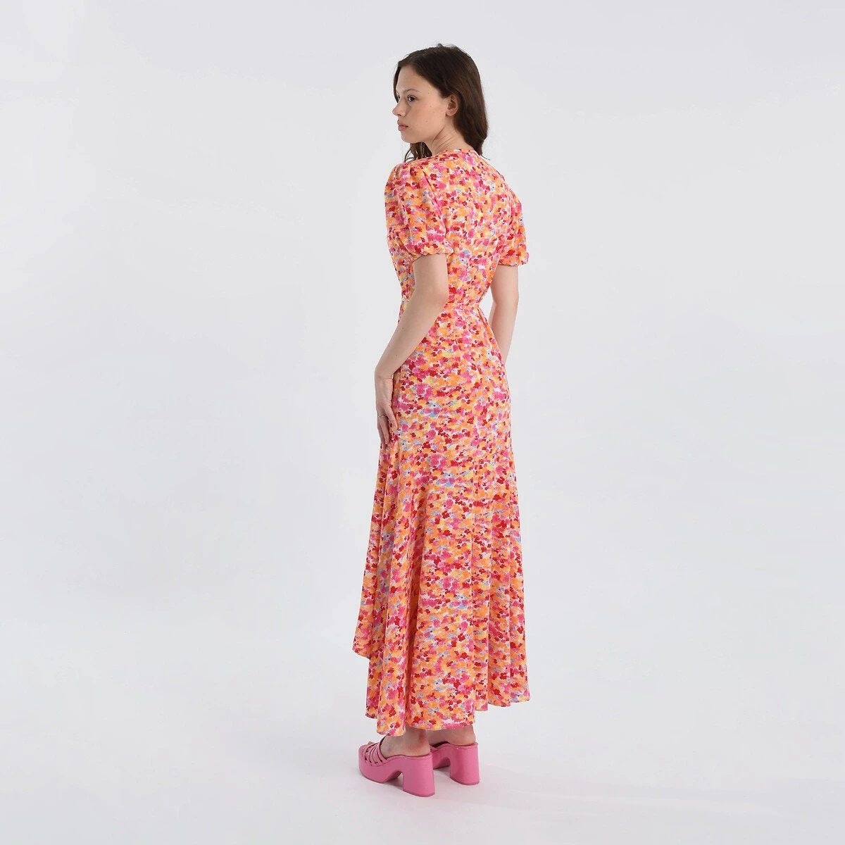 Robe longue, manches courtes ballon, imprimée orange/rose LILI SIDONIO