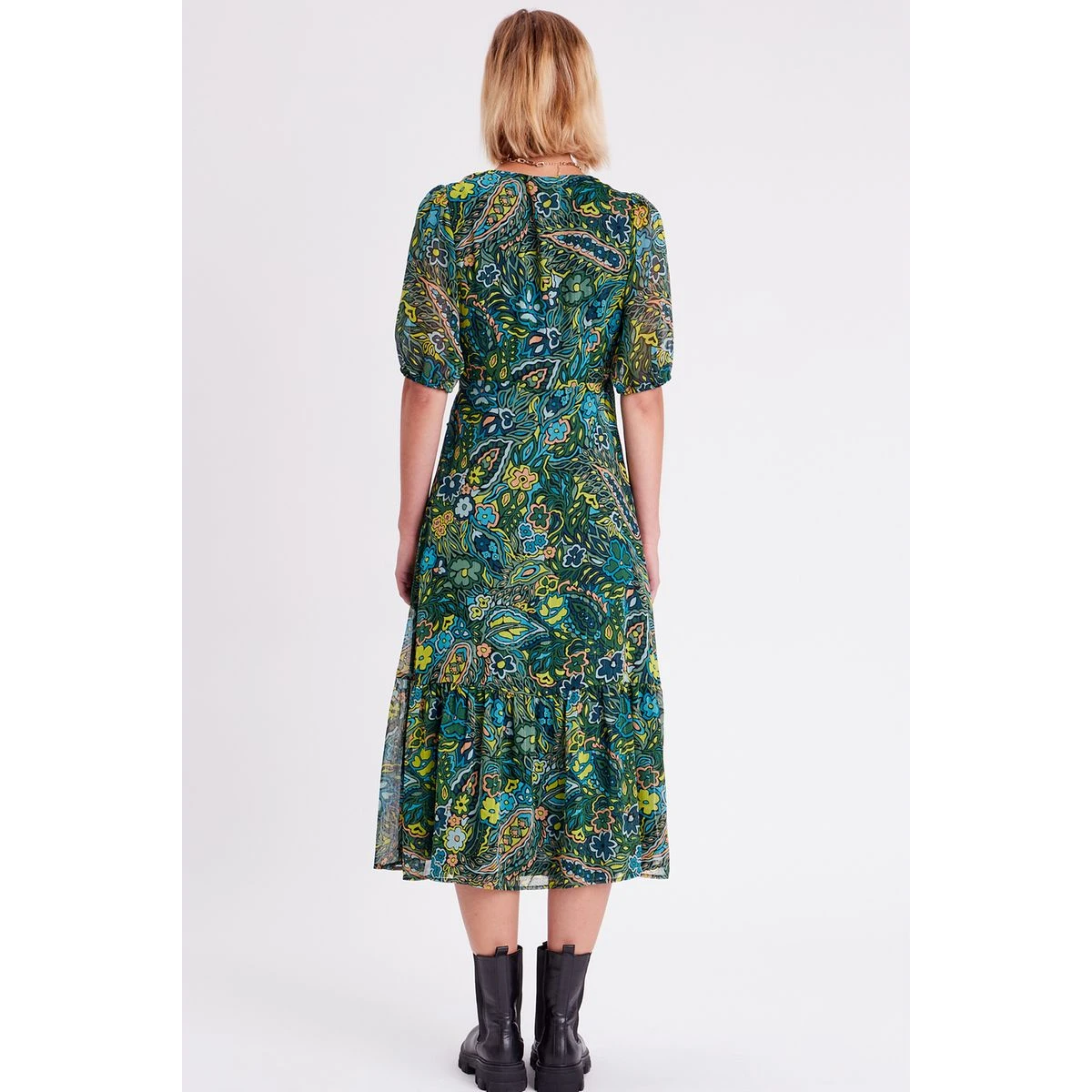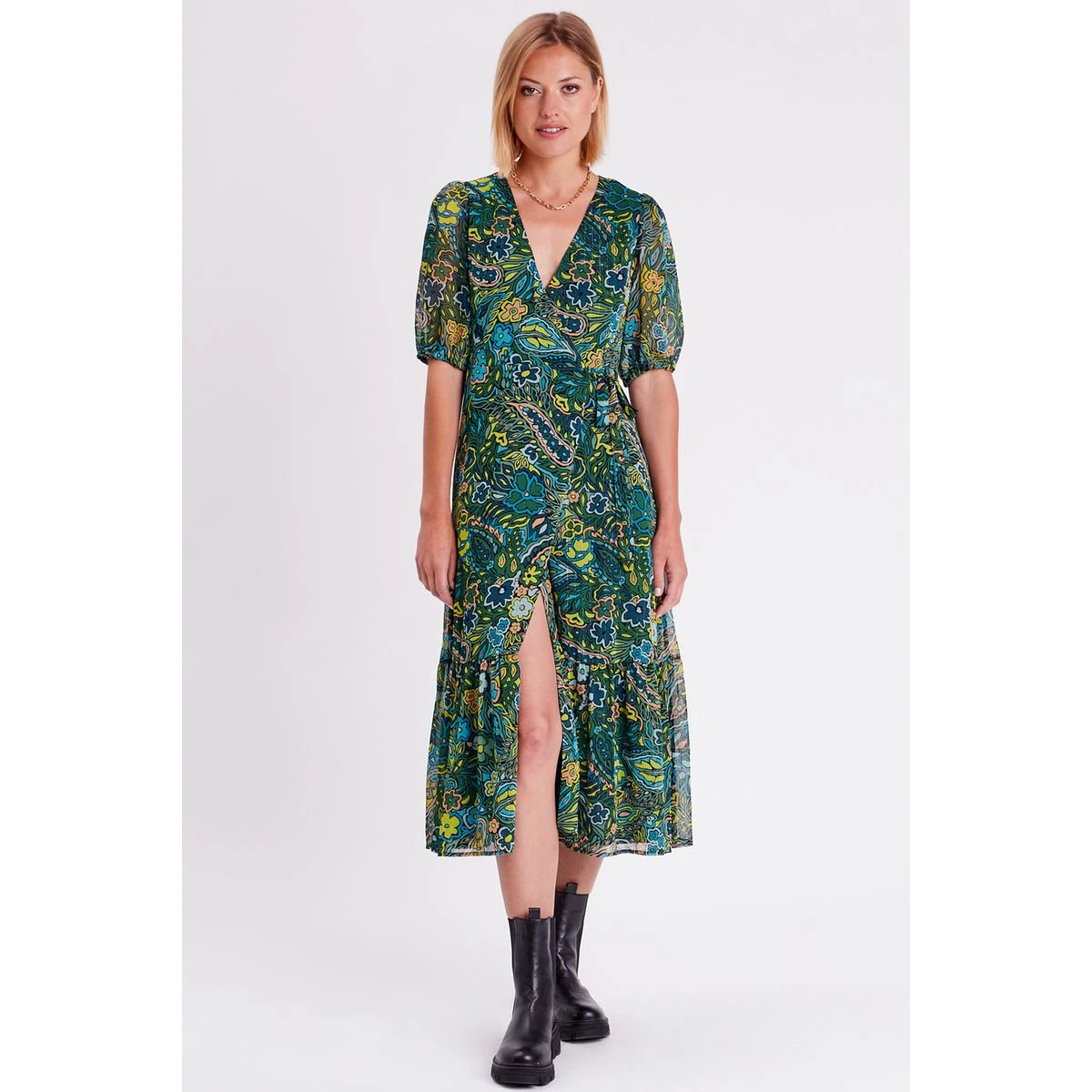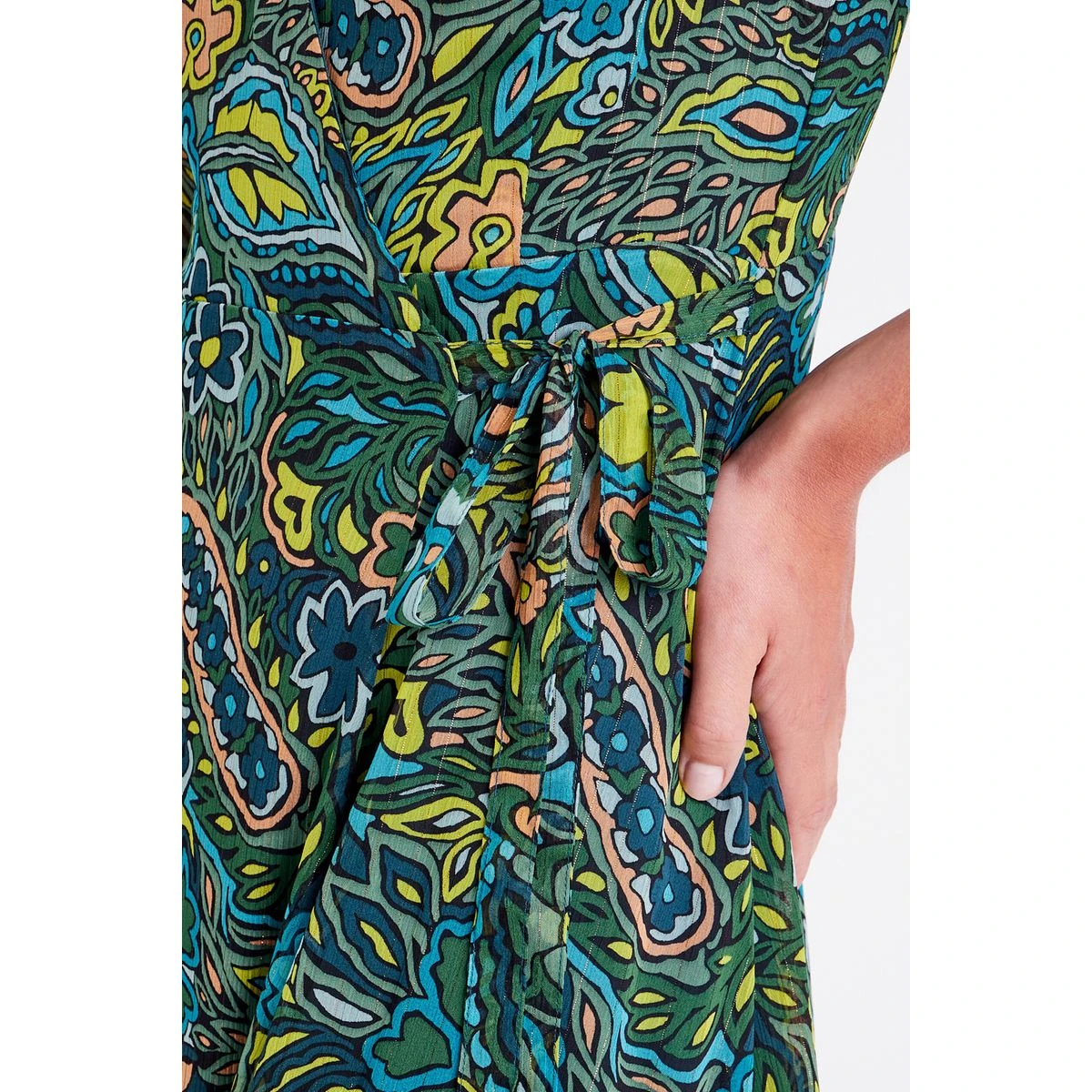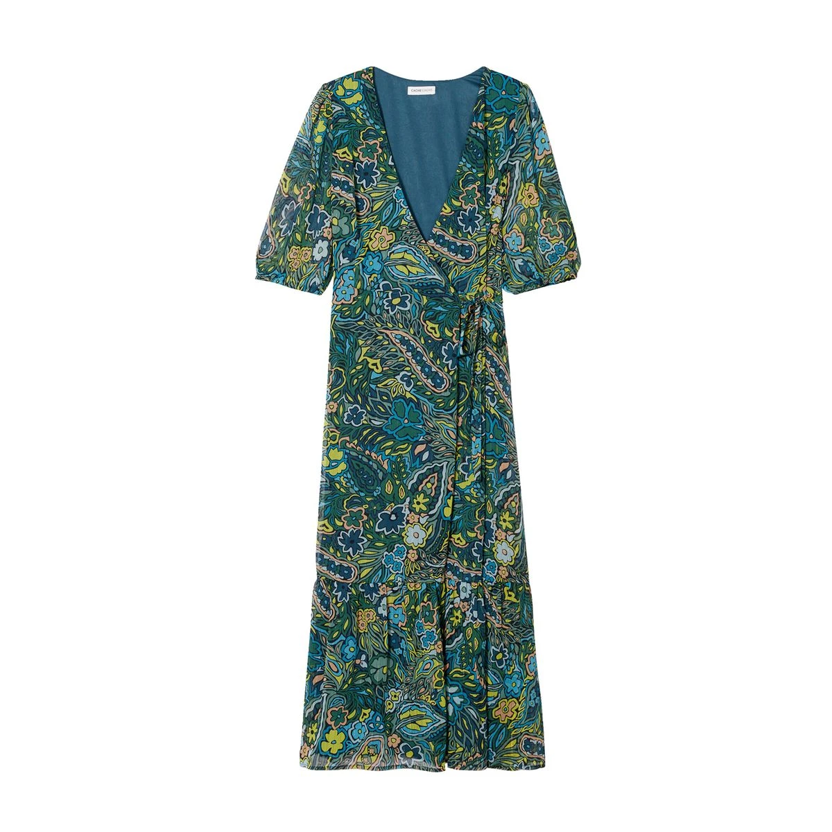 Robe longue portefeuille Coupe portefeuille Longue Col cache-coeur Manches courtes Pans croisés avec bandes à nouer sur le côté de la taille Empiècements volantés sur le bas de la robe Détails fils métallisés Le + mode : son noeud à la taille