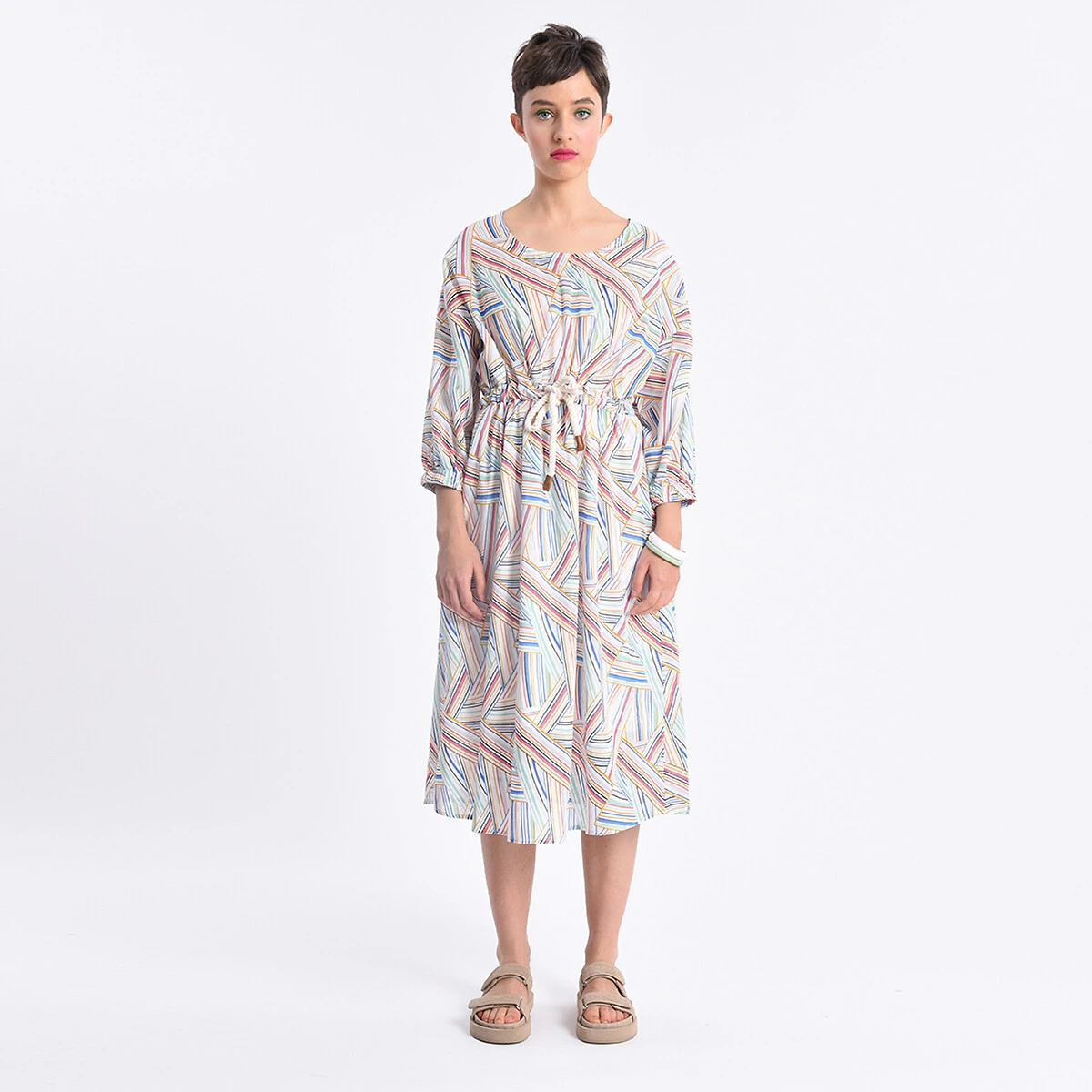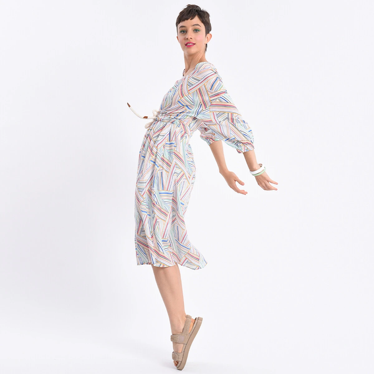 Robe midi coton, ceinture corde, 1/2 manche imprimé fond blanc LILI SIDONIO