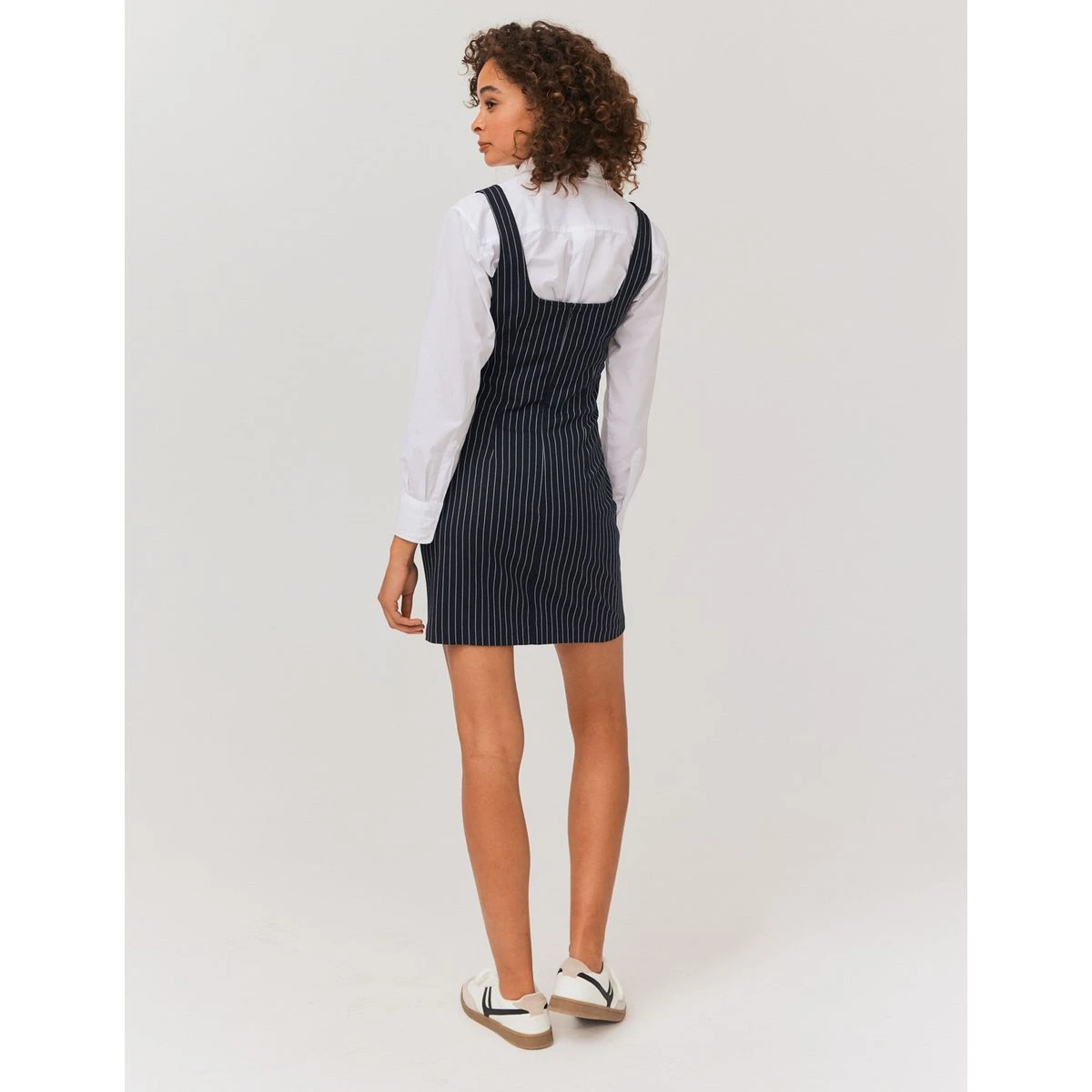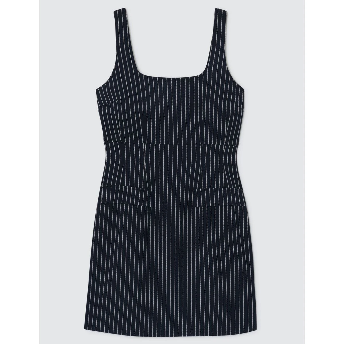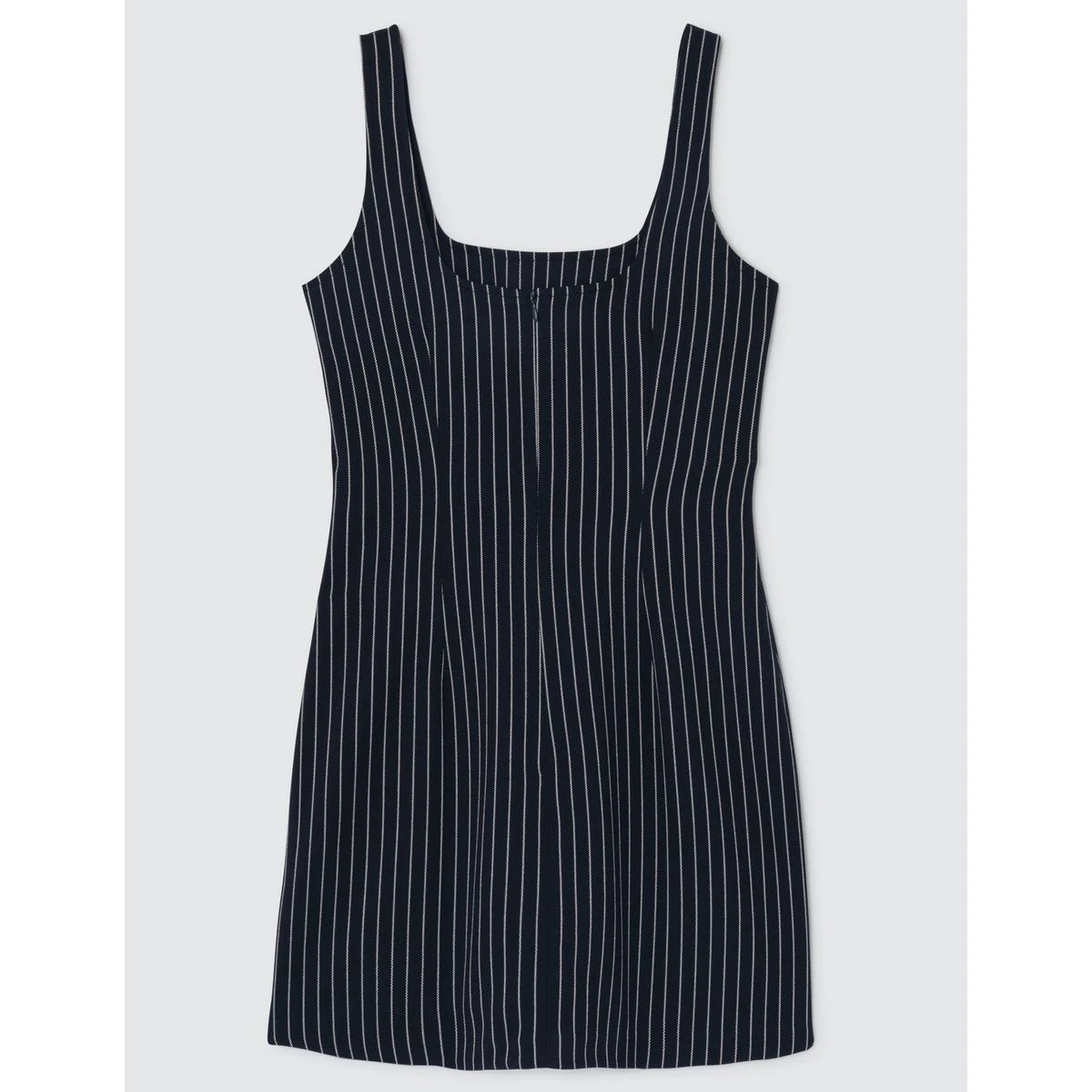 Robe courte rayée – Bretelles – 2 poches passepoilées à l’avant – Pinces au niveau de la poitrine – Fermeture par zip invisible – Plis sur l’arrière de la robe TAILLE ET COUPE – Robe évasée – La mannequin porte une taille 36 et mesure 1m77.