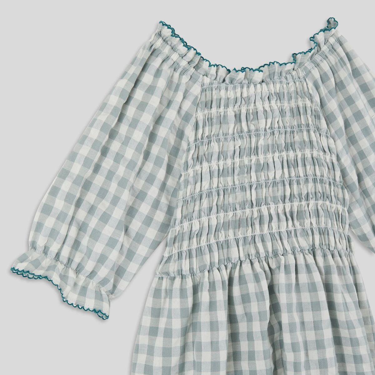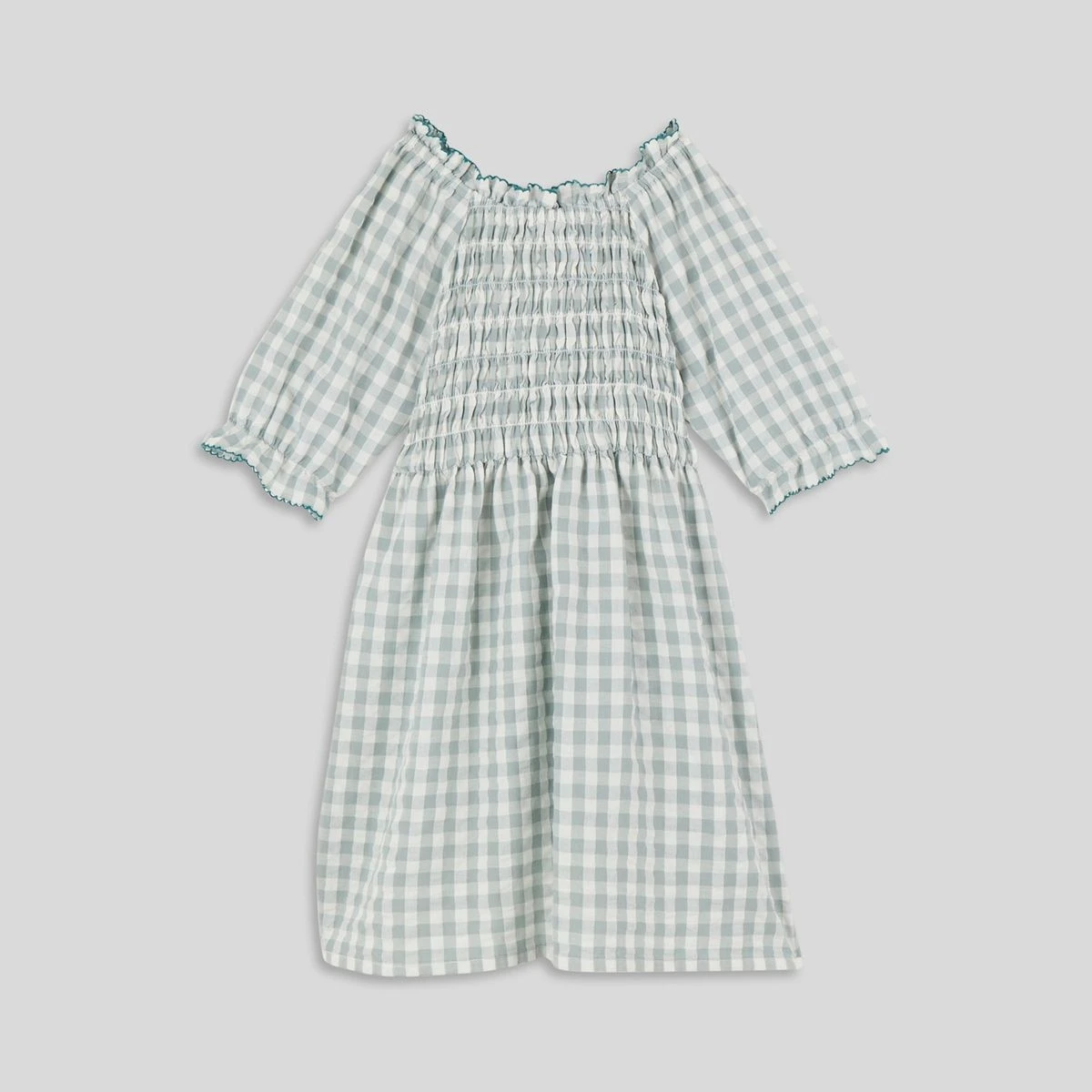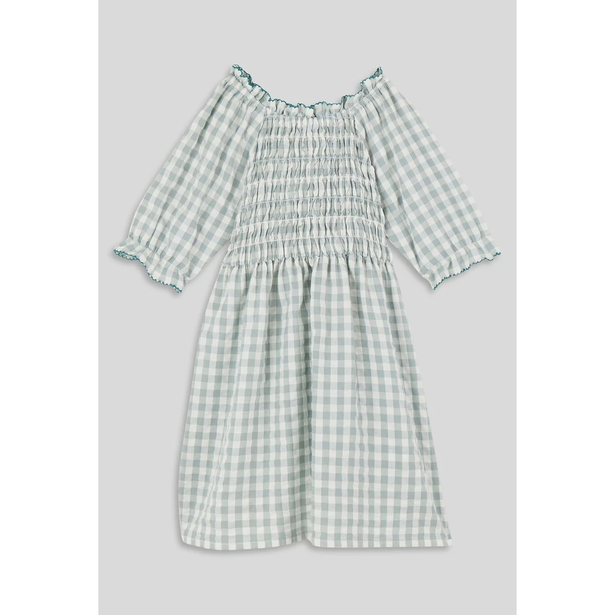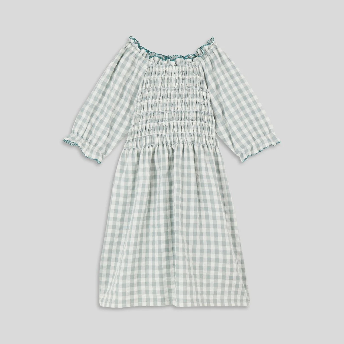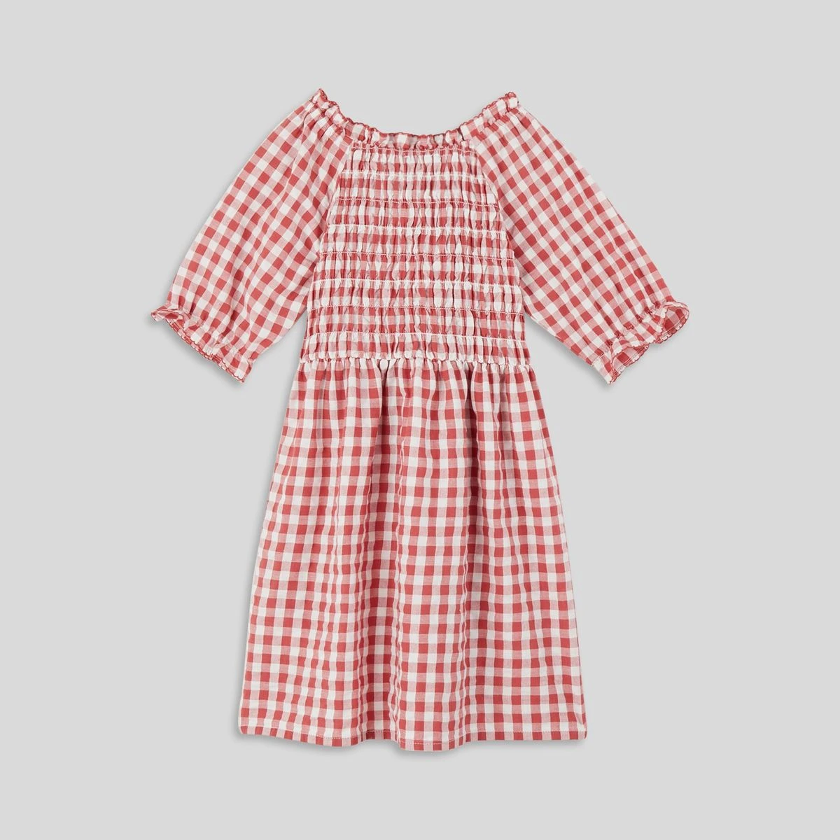 – Robe imprimée vichy à smocks en coton bio – Col bardot élastiqué – Manches courtes raglan – Finitions volants et broderie au col et aux manches – Tissu léger – Numéro de modèle : T31790073