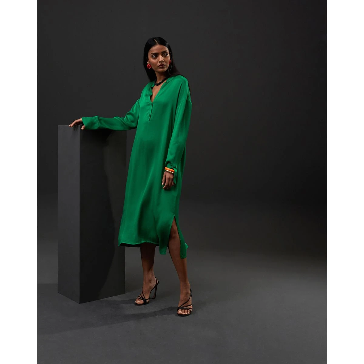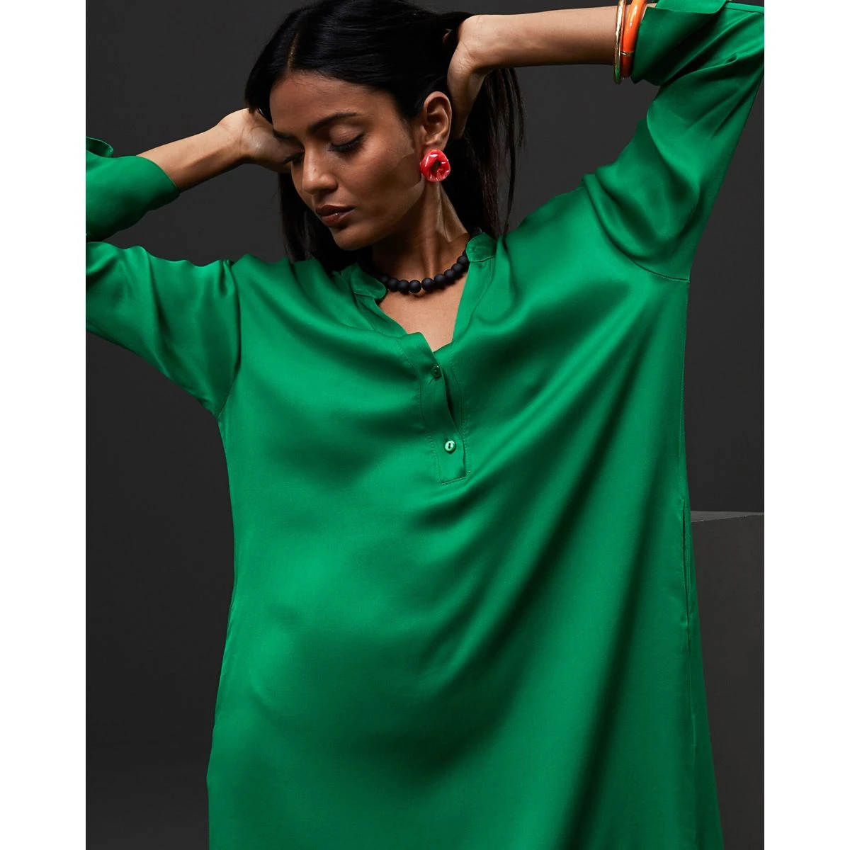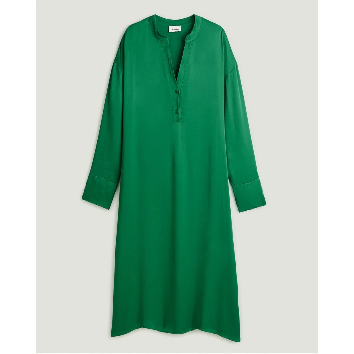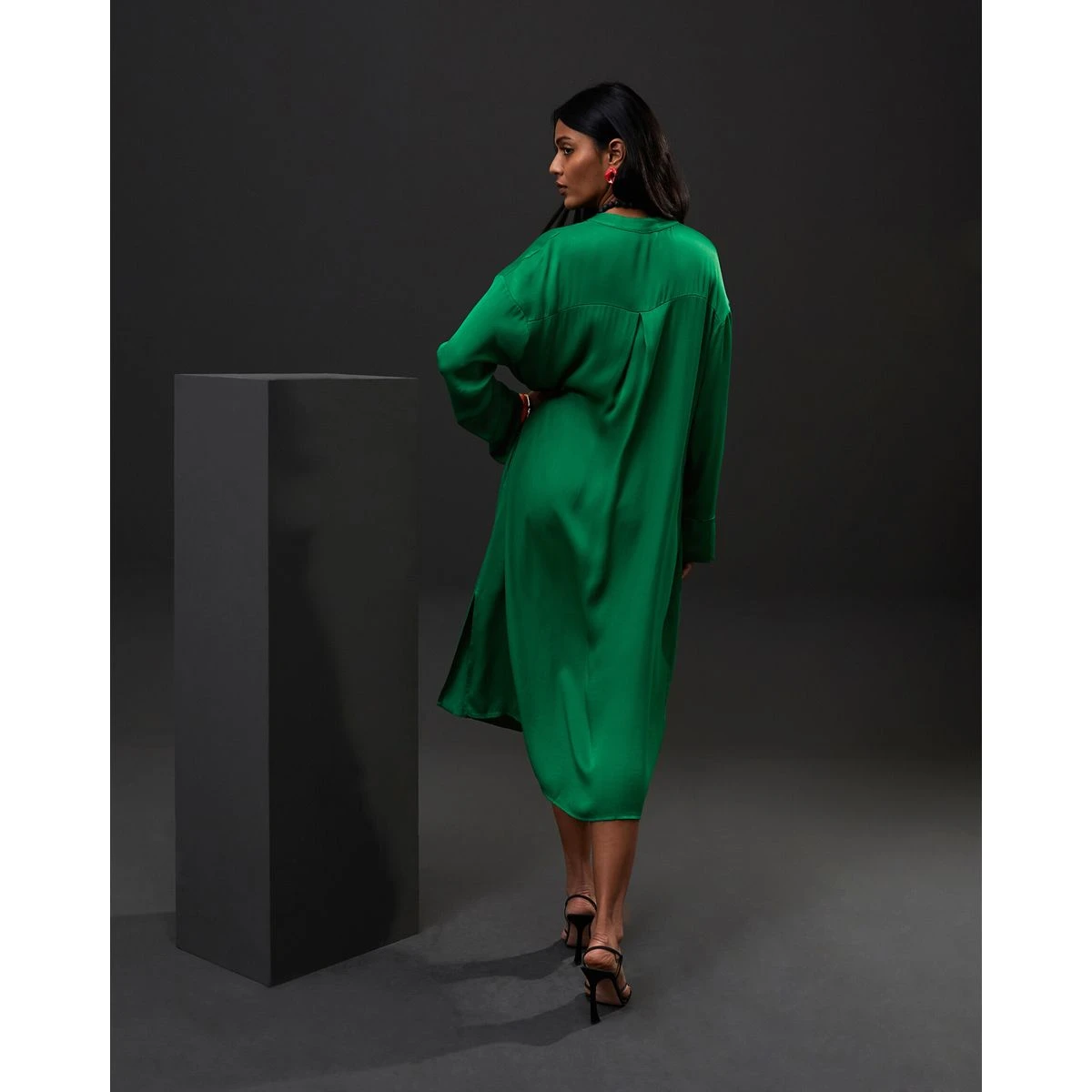 La robe chemisier longueur midi en satin verte est la pièce idéale pour les fêtes de fin d’année ou pour une belle journée ensoleillée. On aime sa fluidité et son volume oversize. Elle se porte également ceinturée avec une joile ceinture chaîne. N’hésitez pas à l’envelopper du poncho tartan et l’agrémenter du sac en cuir Adèle. Mémo : cette pièce taille grande et se porte oversize.