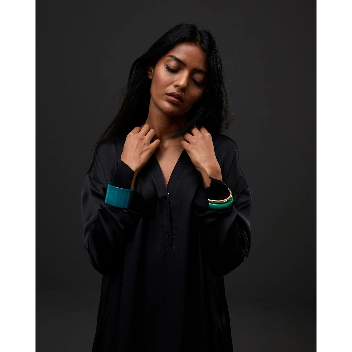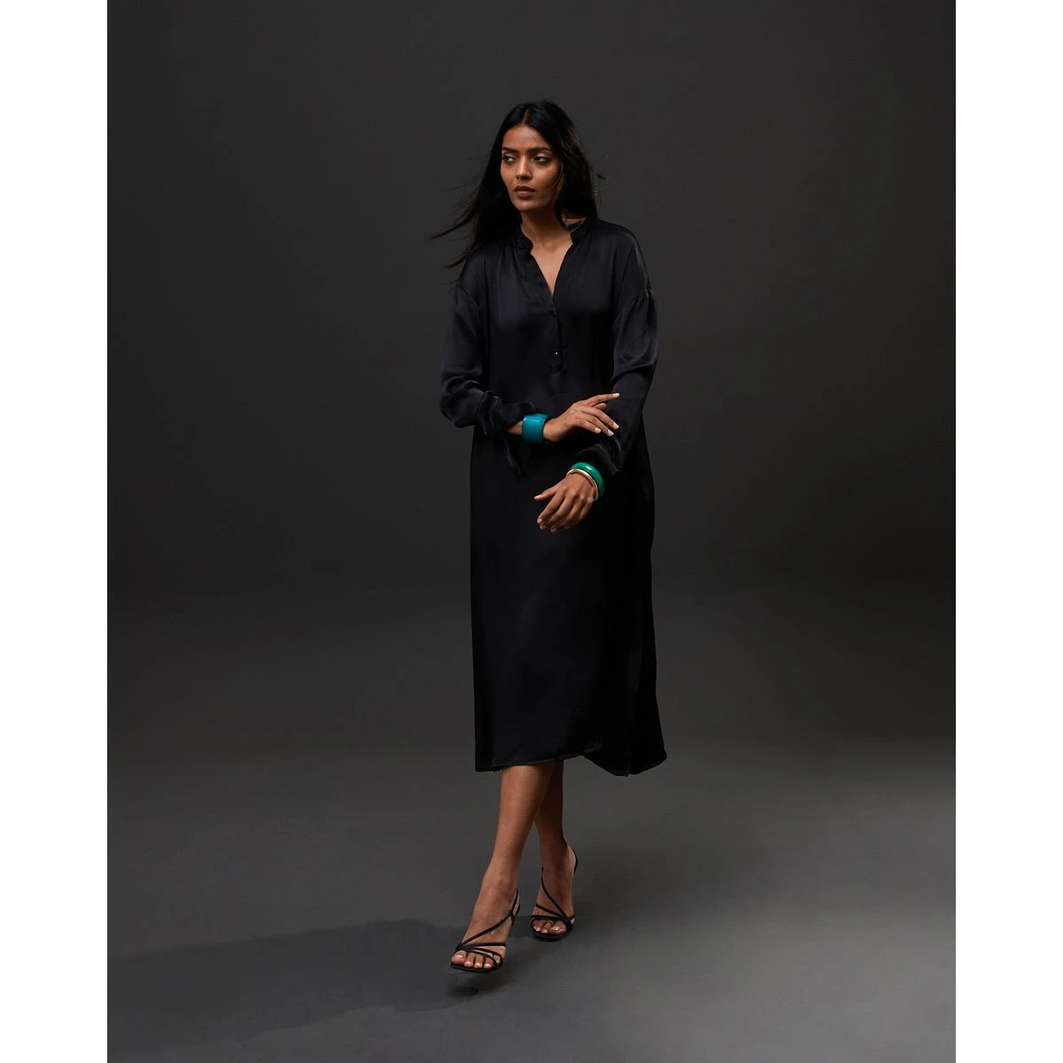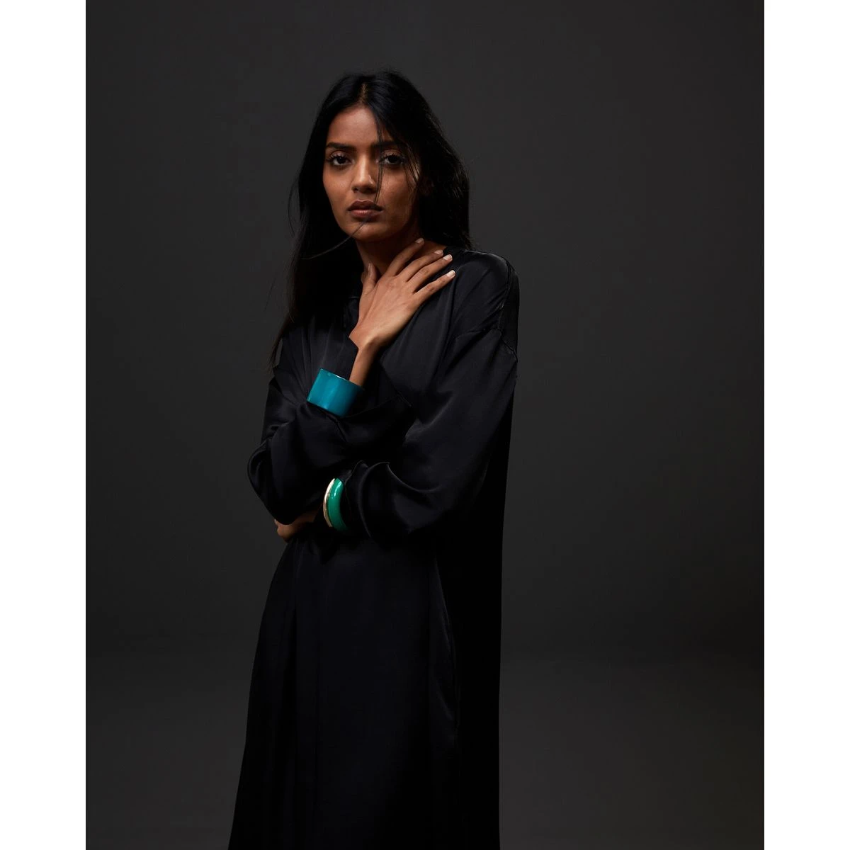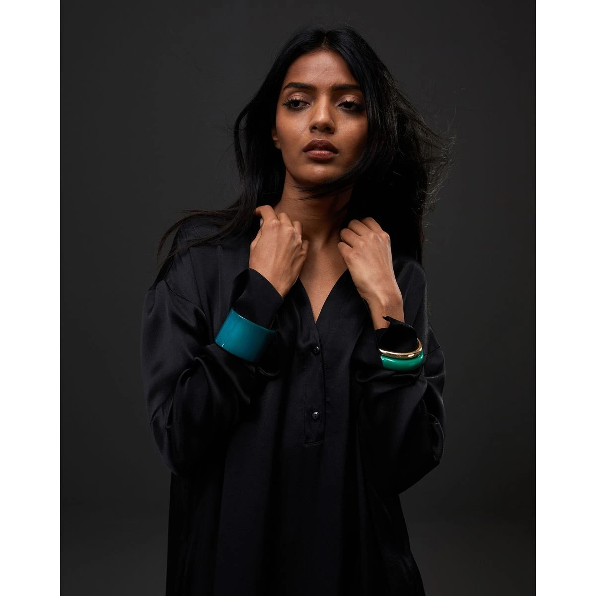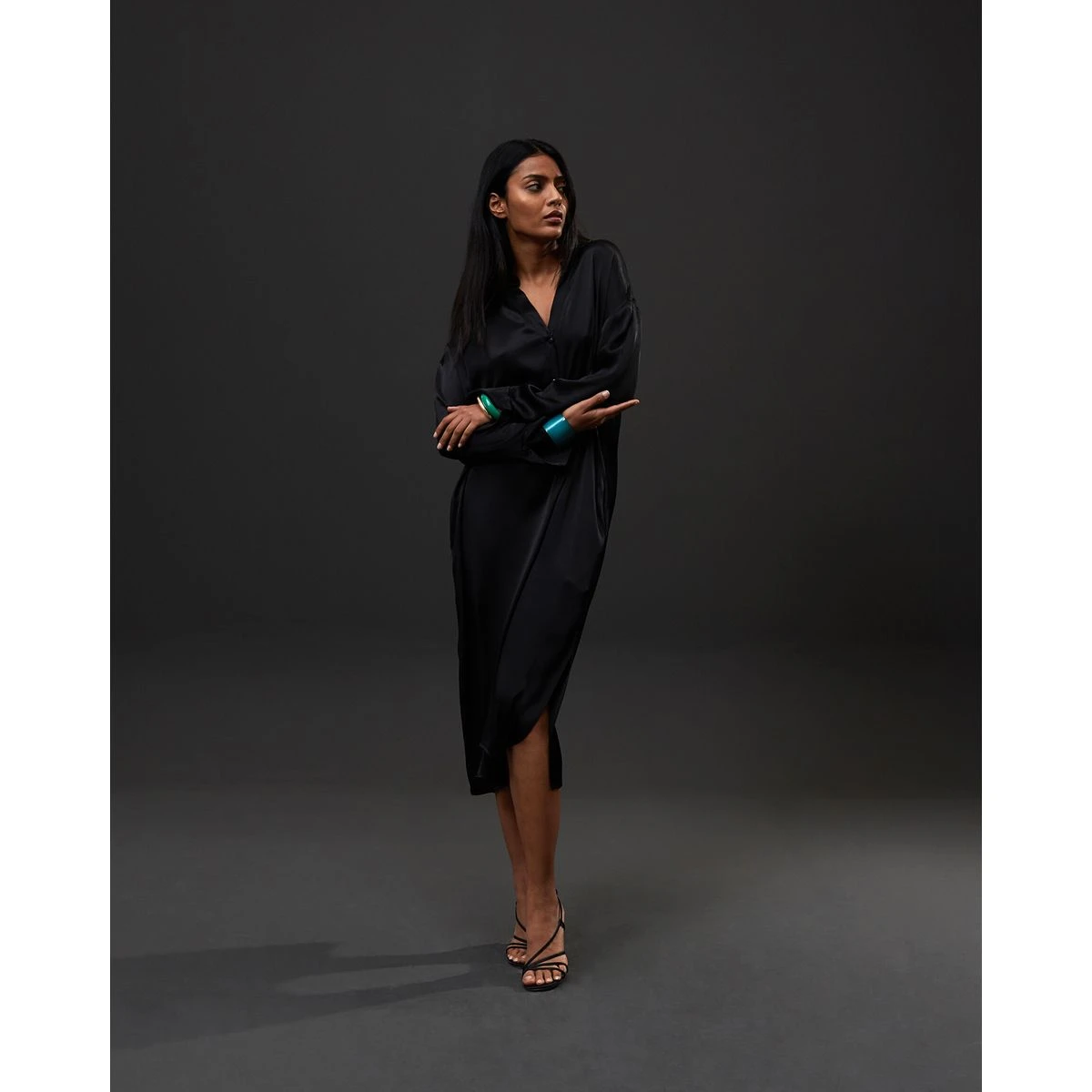 La robe chemisier longueur midi en satin verte est la pièce idéale pour les fêtes de fin d’année ou pour une belle journée ensoleillée. On aime sa fluidité et son volume oversize. Elle se porte également ceinturée avec une joile ceinture chaîne. N’hésitez pas à l’envelopper du poncho tartan et l’agrémenter du sac en cuir Adèle. Mémo : cette pièce taille grande et se porte oversize.