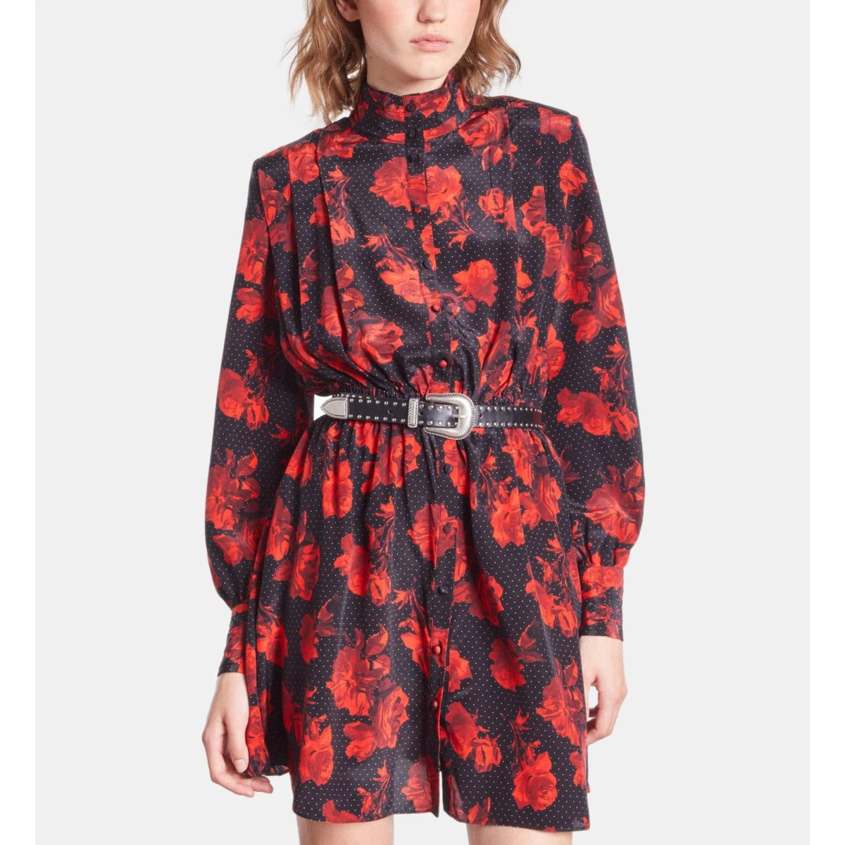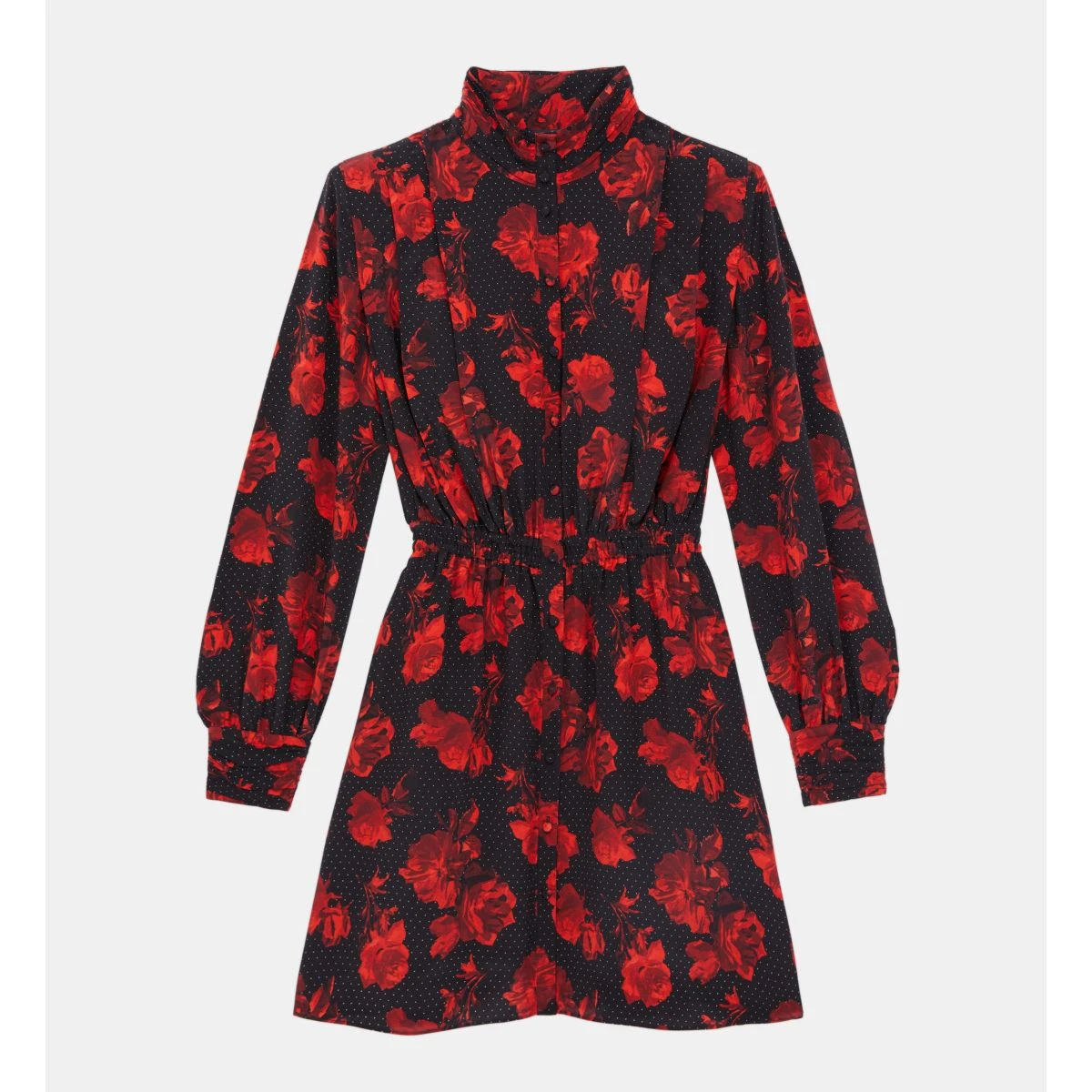 | Imprimé fleuri noir et rouge | Col classique | Manches longues | Boutons aux poignets | Taille élastiquée | Longueur 88,5cm pour une taille 36 | La ceinture n’est pas fournie avec la robe |