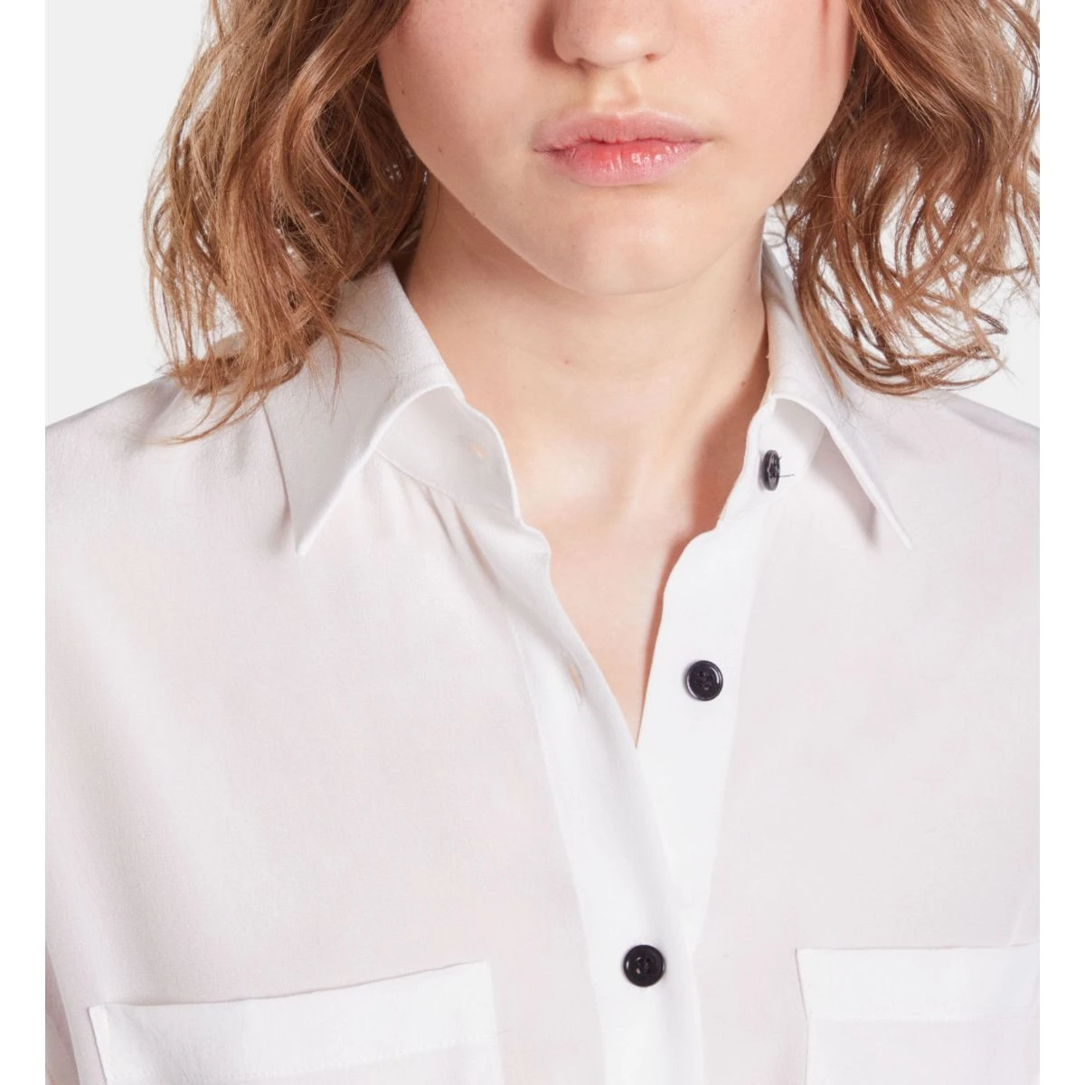 | Haut style chemise en soie | Manches longues | Boutons aux poignets | Poches plaquées à la poitrine | Boutons contrastés noirs | Fronces à la taille | Bas plissé doublé | Longueur 88cm pour une taille 36 |
