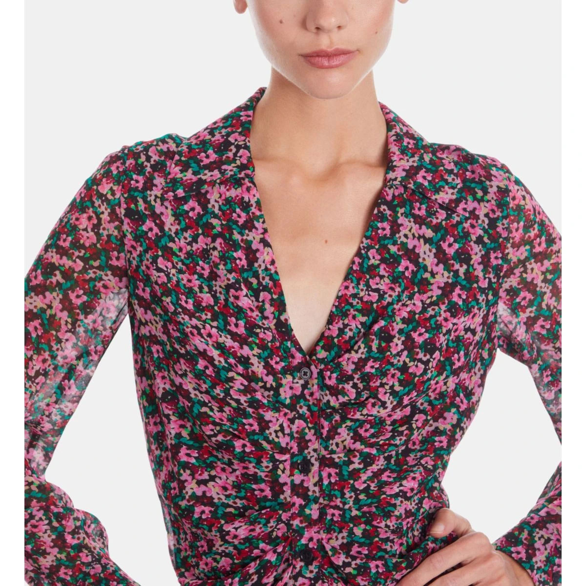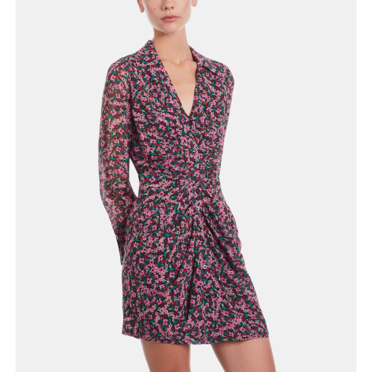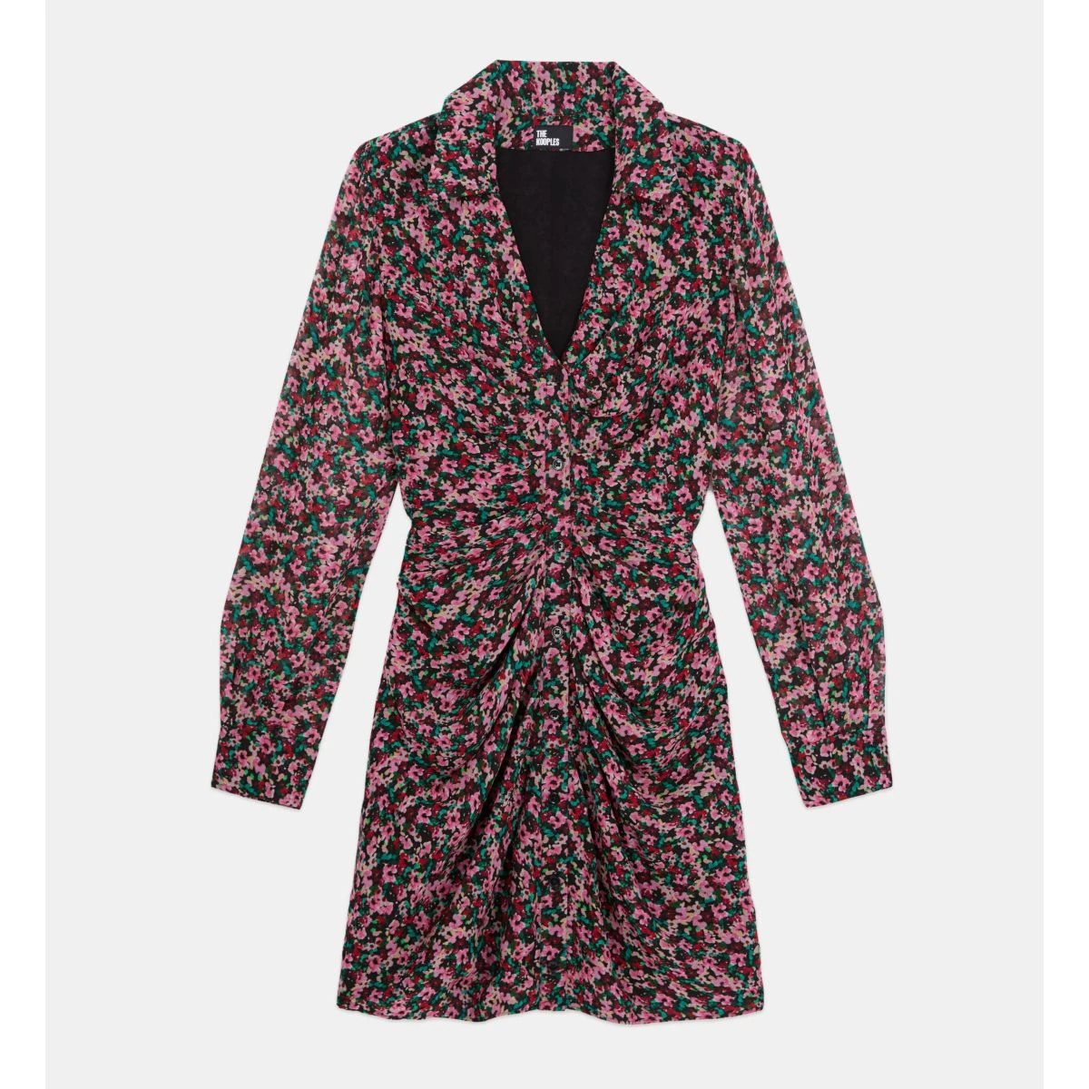 | Imprimé fleuri multicouleur | Col chemise avec décolleté en V | Manches longues | Boutons aux poignets | Patte de boutonnage avec fronces | Robe doublée | Longueur 85cm pour une taille 36 |